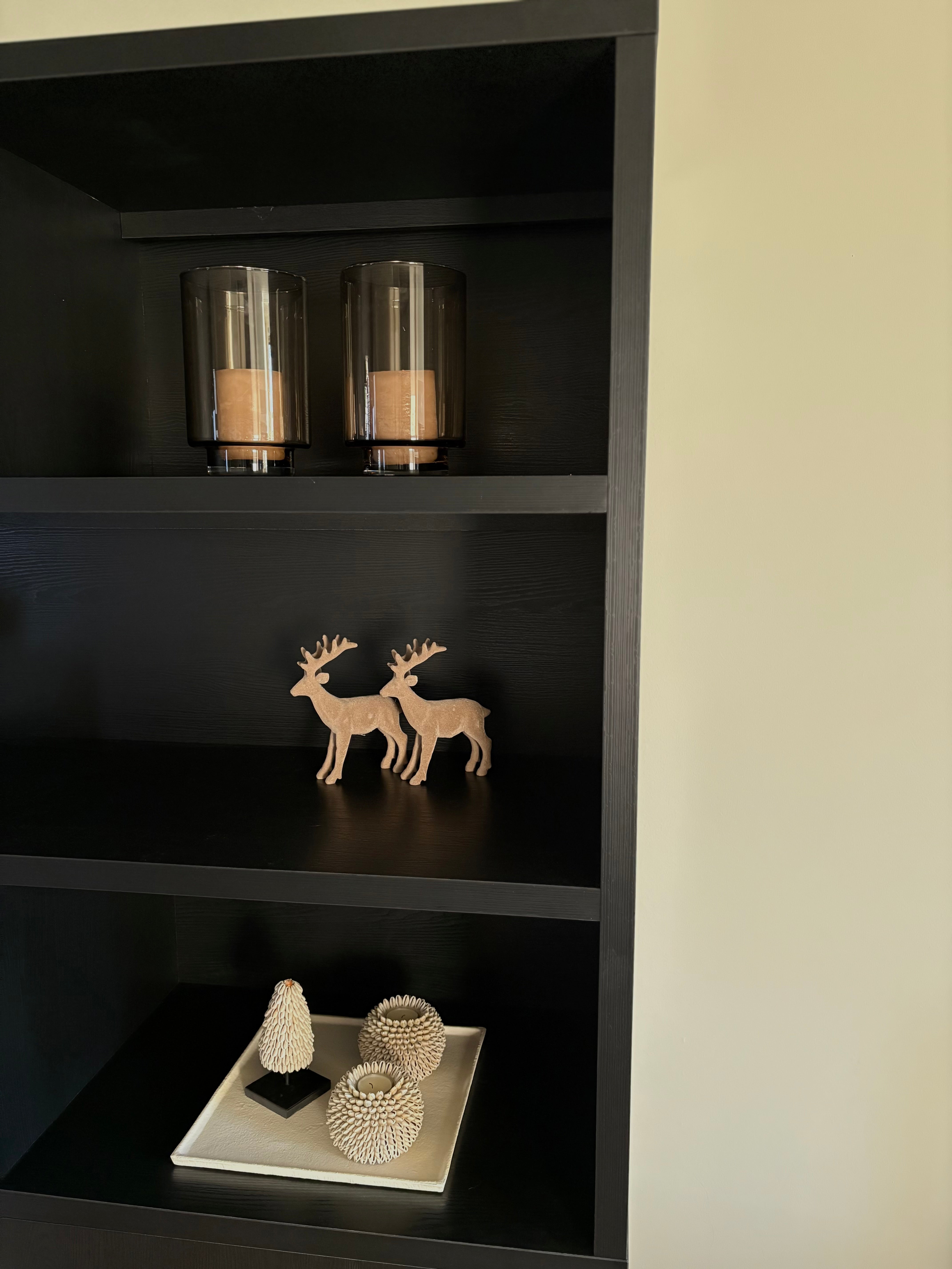 Ornamenten zoals schelpenkettingen, agaatschijven op standaard en decoratieve beelden passen perfect op een vakkenkast. De variëteit in materialen zorgt voor een rijke, dynamische uitstraling. Het kan ook helpen om de ruimte visueel in balans te brengen. -