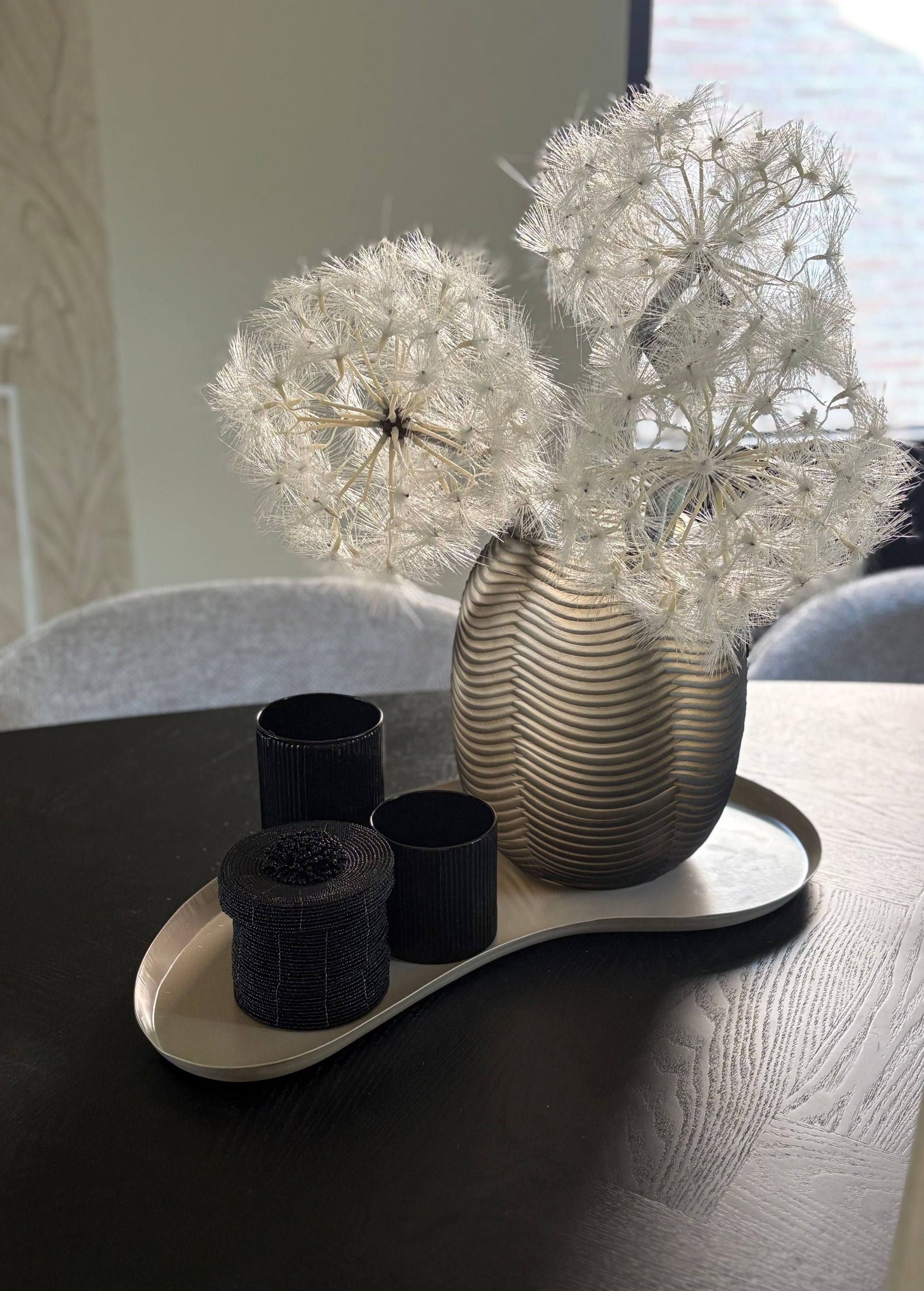 - Op de salontafel: Gebruik het als basis voor een luxe styling met een combinatie van koffietafelboeken, kaarsenhouders met lange dinerkaarsen, en een klein object zoals een decoratief beeld. Het organische silhouet breekt de rechte lijnen van een tafel.