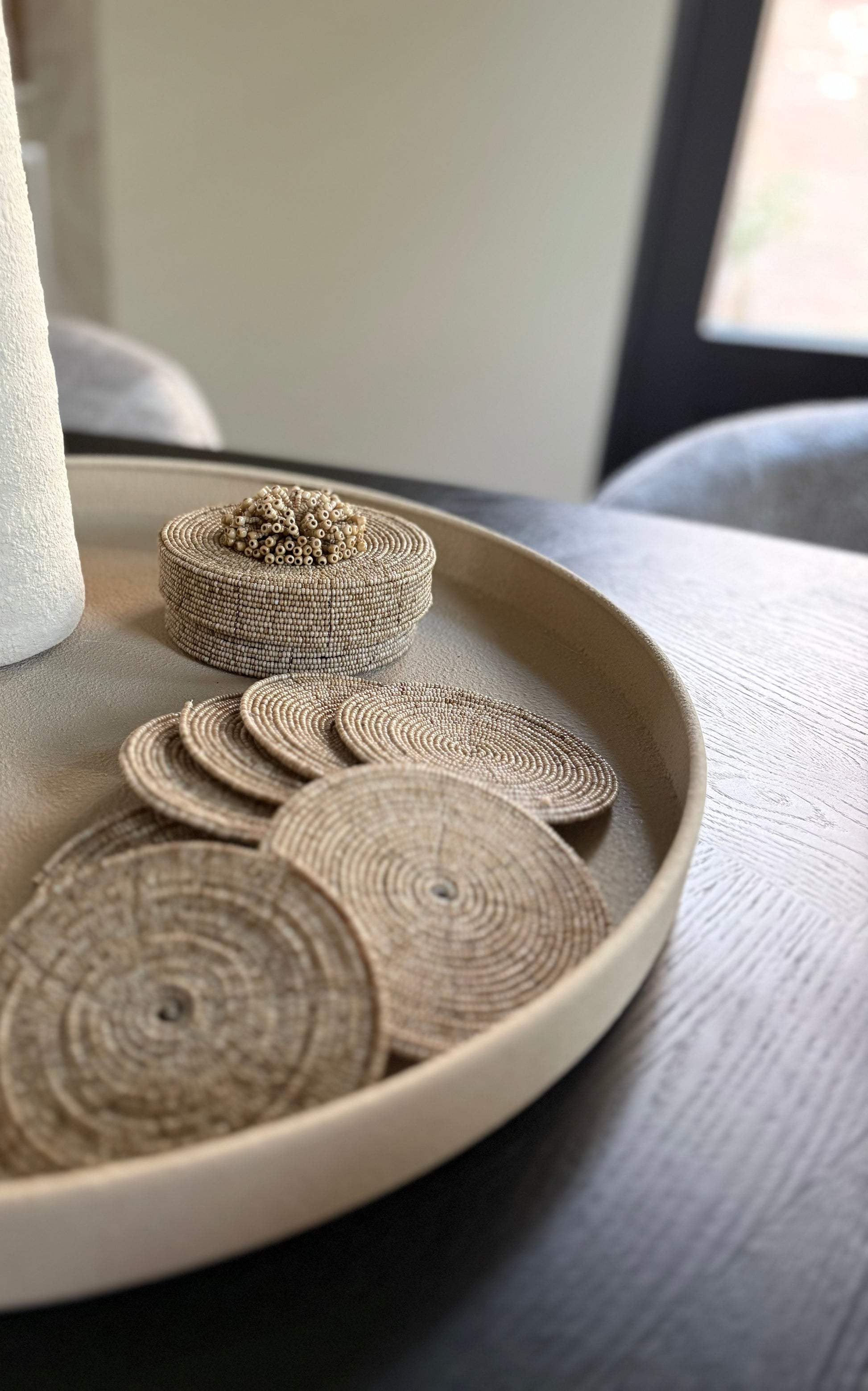 Kralenonderzetters met opbergmandje | Taupe | 10 stuks onderzetters