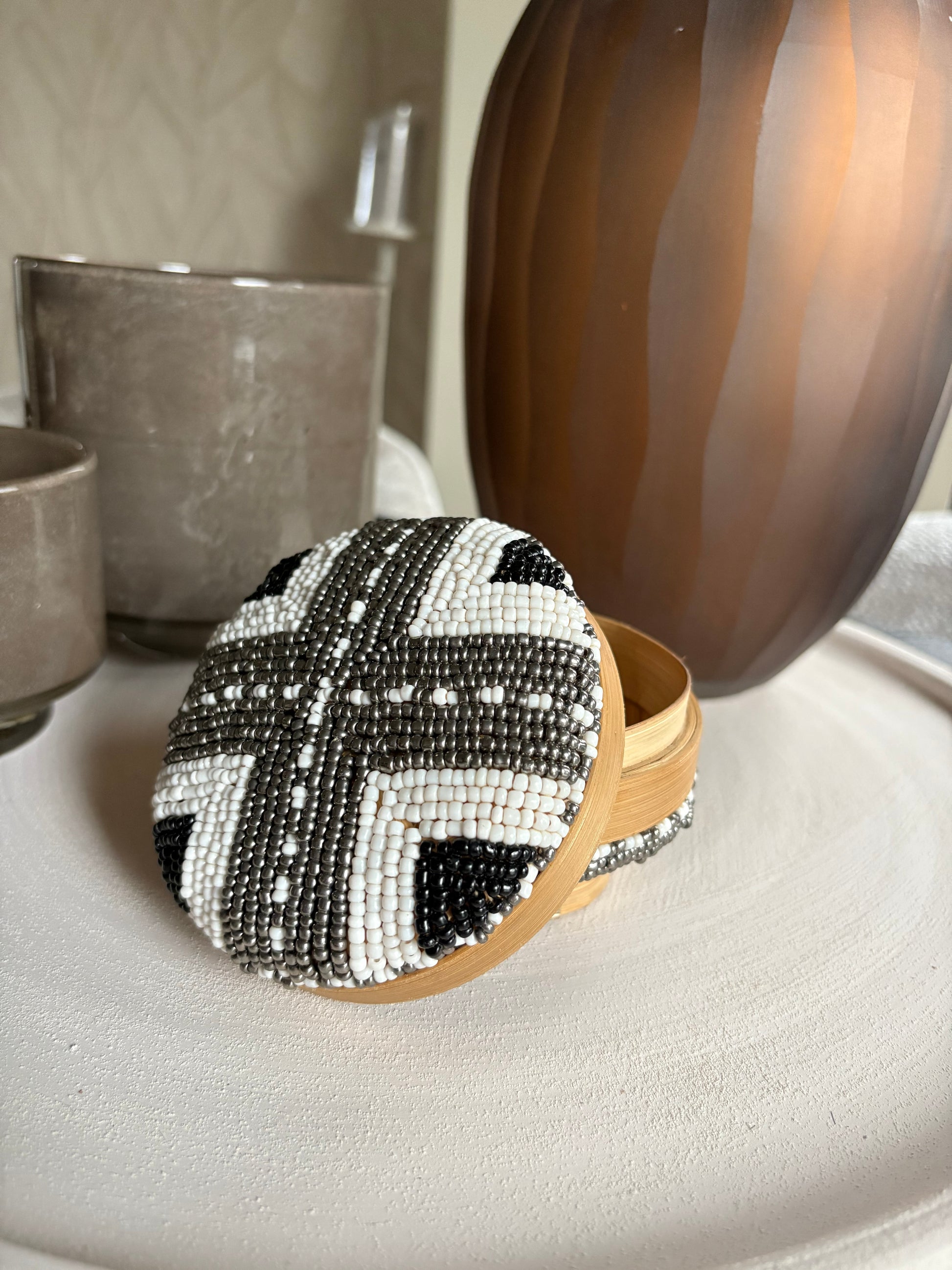 Deze elegante opbergboxen zijn met de hand gevlochten van natuurlijke palmbladeren en volledig versierd met glaskralen. Deze prachtige offermanden zijn de eye catchers voor je interieur, gebruik ter decoratie voor in de vakkenkast, of op een dressoir. Daarnaast is het een stijlvolle manier om kleine items in op te bergen!