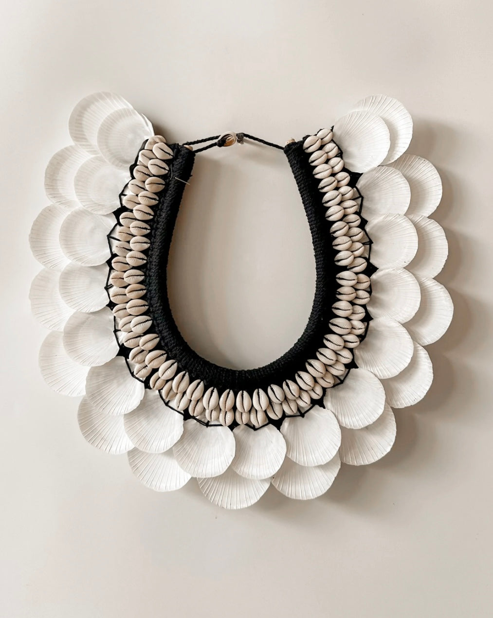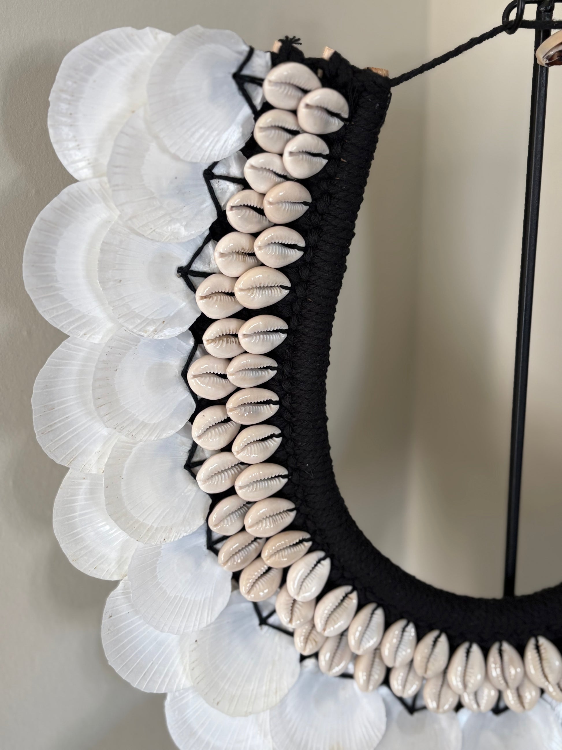 Papua schelpenkraag op standaard | Schelpendecoratie| Schelpenketting zwart wit