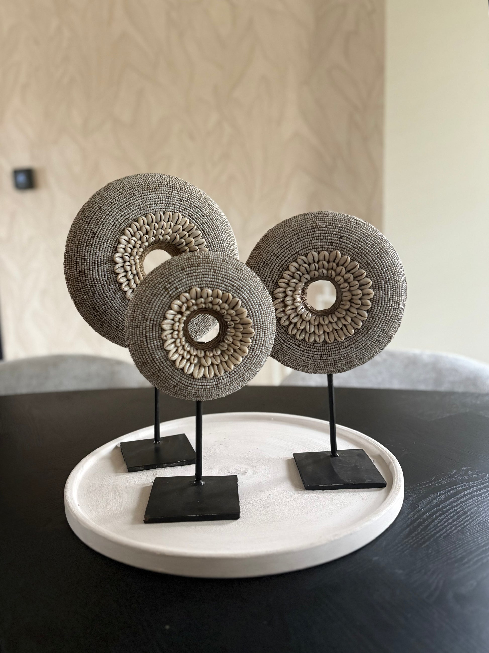 Prachtige handgemaakte schelpen standaarden, deze decoratie heeft een donut vorm. De schelpenstandaard is opgemaakt met kralen in een taupe kleur met daarbij kauri schelpen. Deze unieke items zijn volledig met de handgemaakt door indonische vakmensen. Ieder stuk is hierdoor uniek.