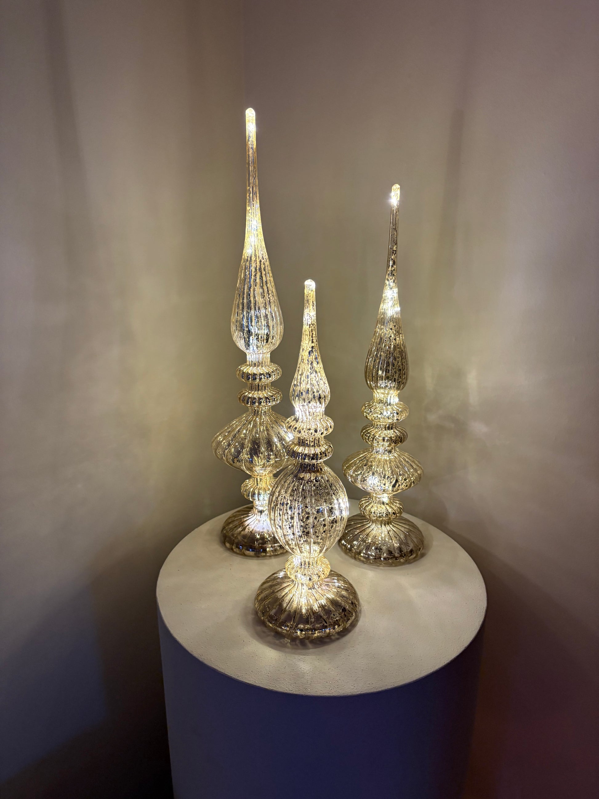Deze gezellige en sfeervolle set van drie kerstpieken met sfeerverlichting zijn de trend van dit moment. Deze kerstpieken geven een sfeervolle kerstsfeer aan je interieur. De set bestaat uit drie pieken die werken op AA batterijen, ze geven een warm sfeerlicht af!