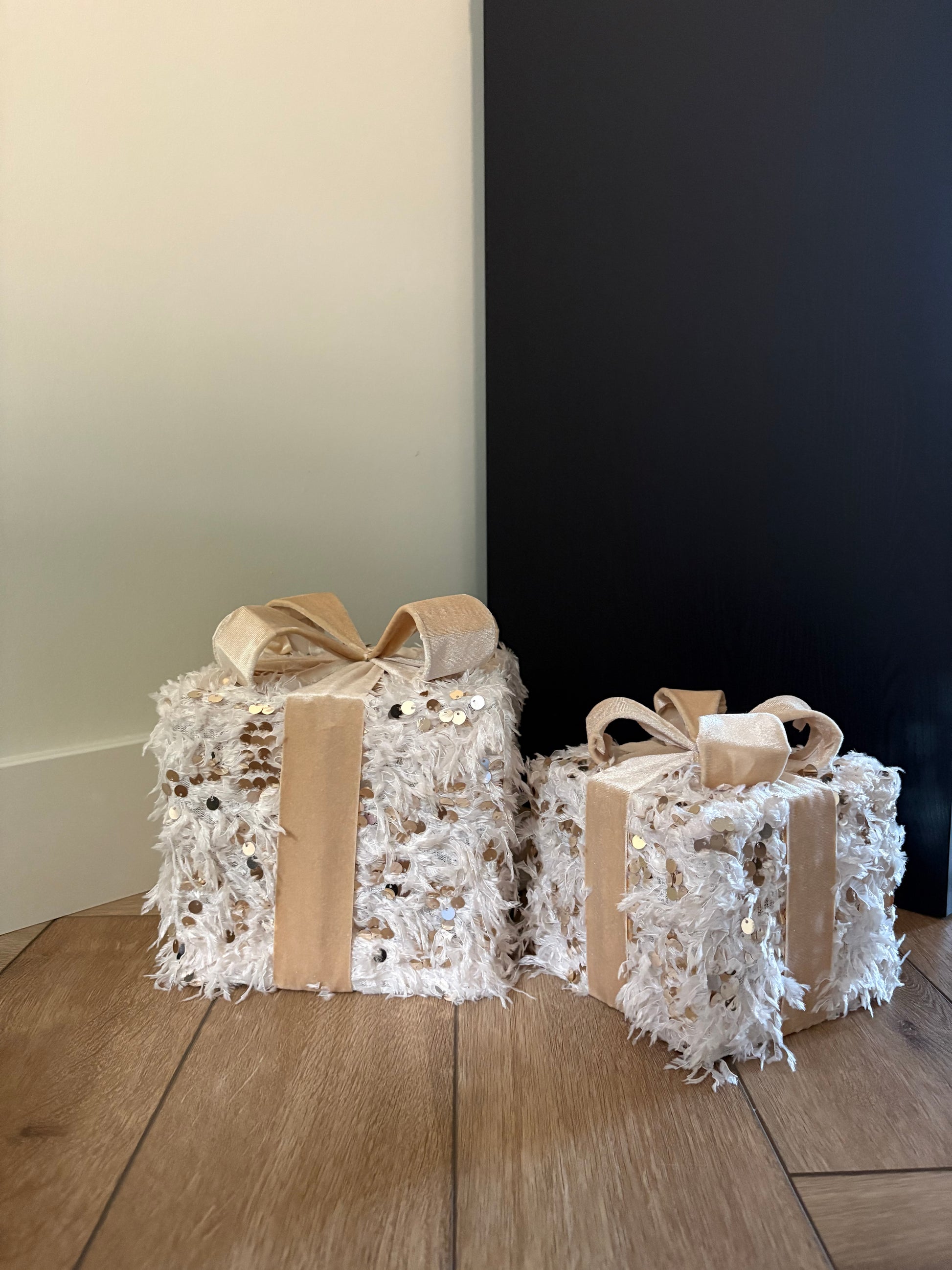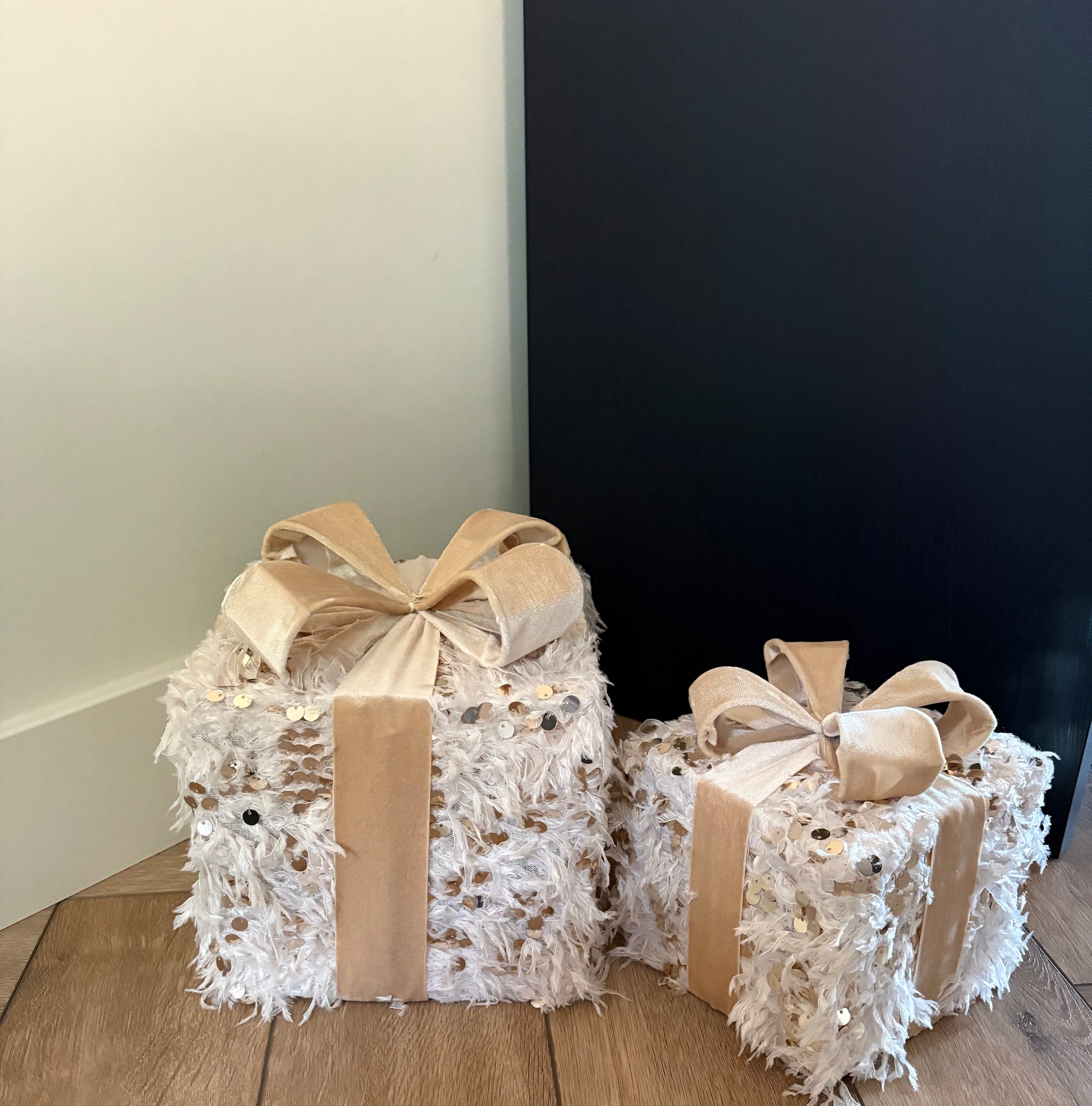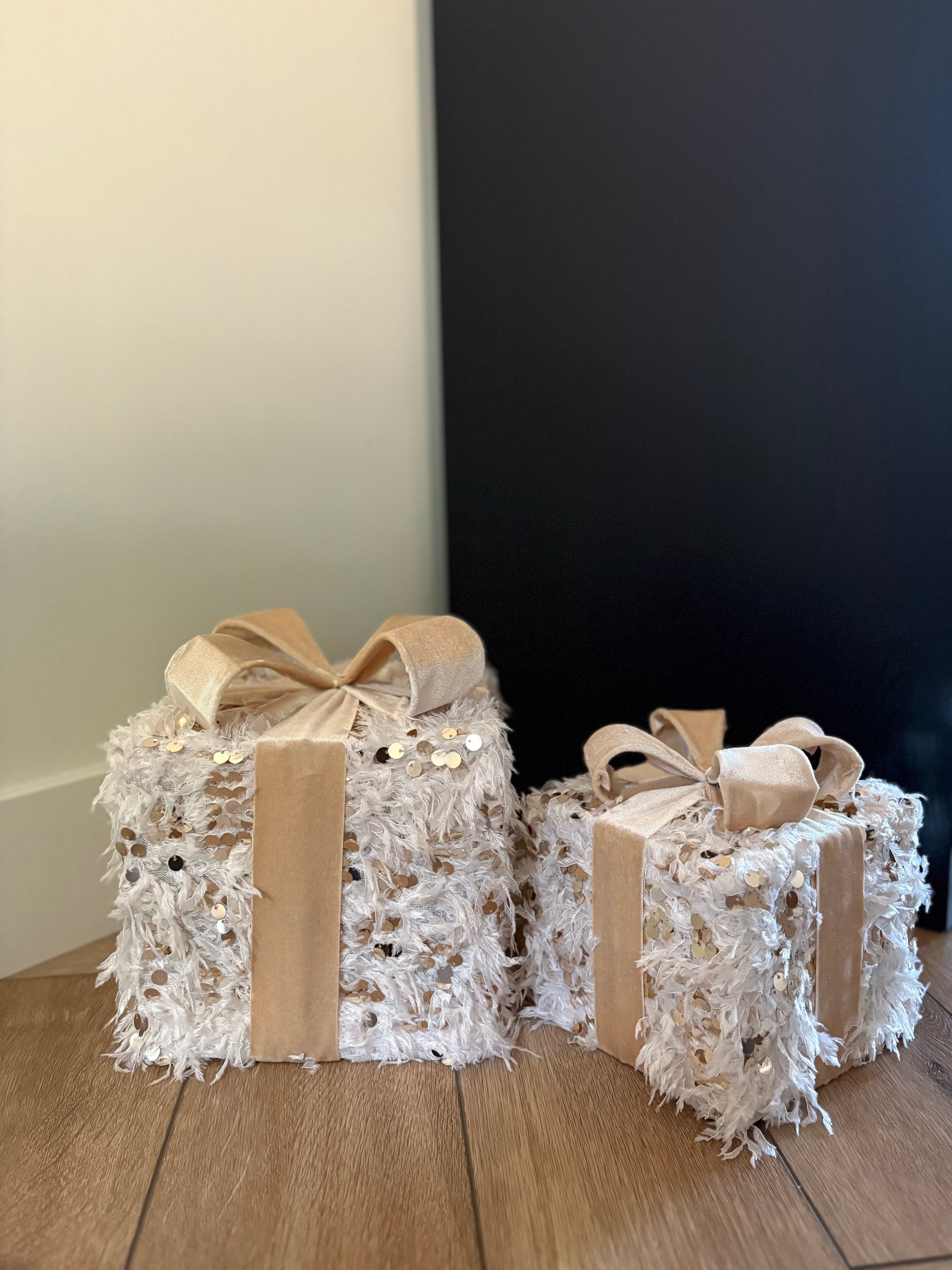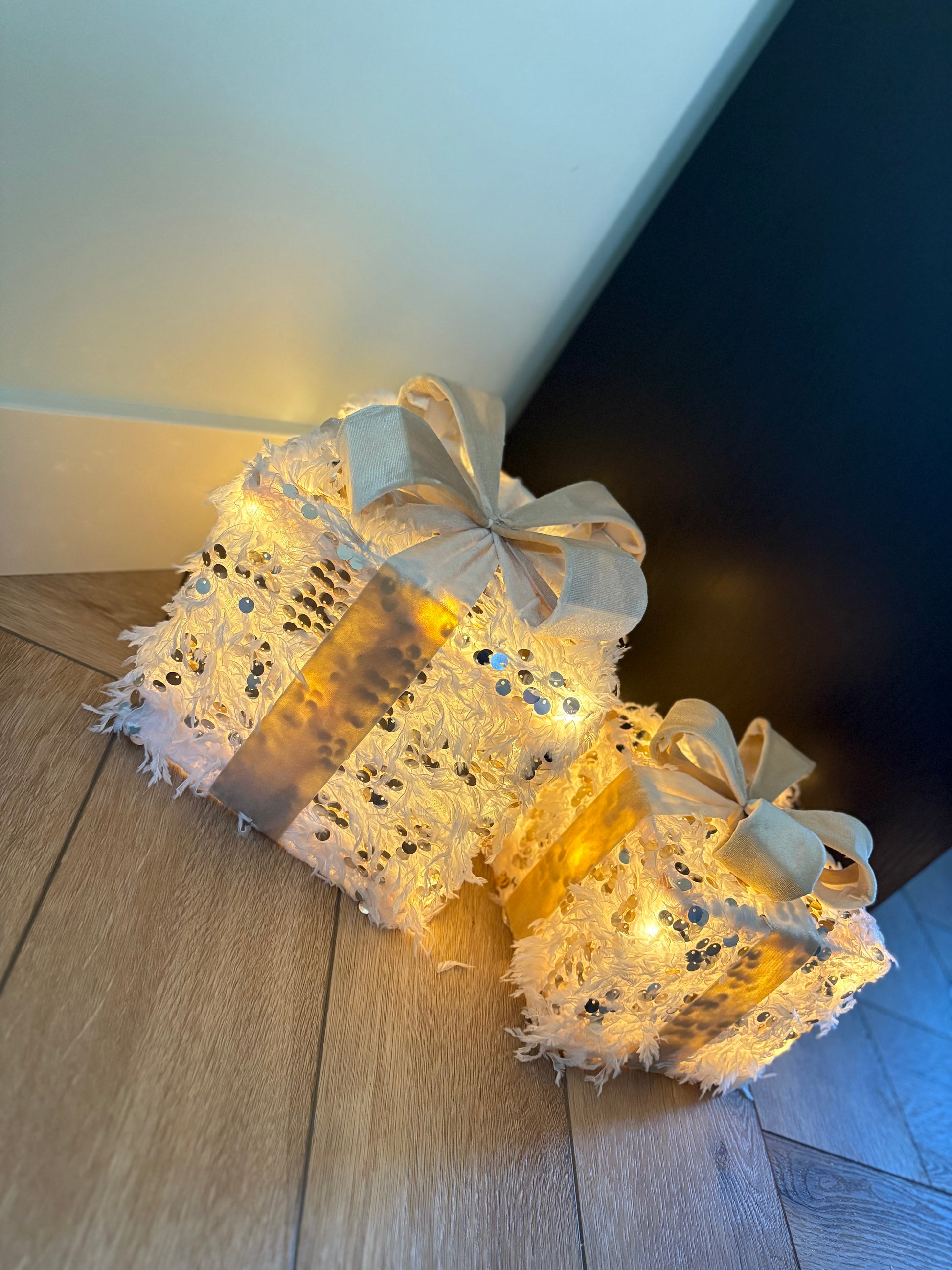 Set van twee hele leuke kerstcadeautjes in een beige kleurtje! Op de cadeautjes zit een mooie grote gouden strik. In de cadeautjes zit verlichting die werkt op AA batterijen.