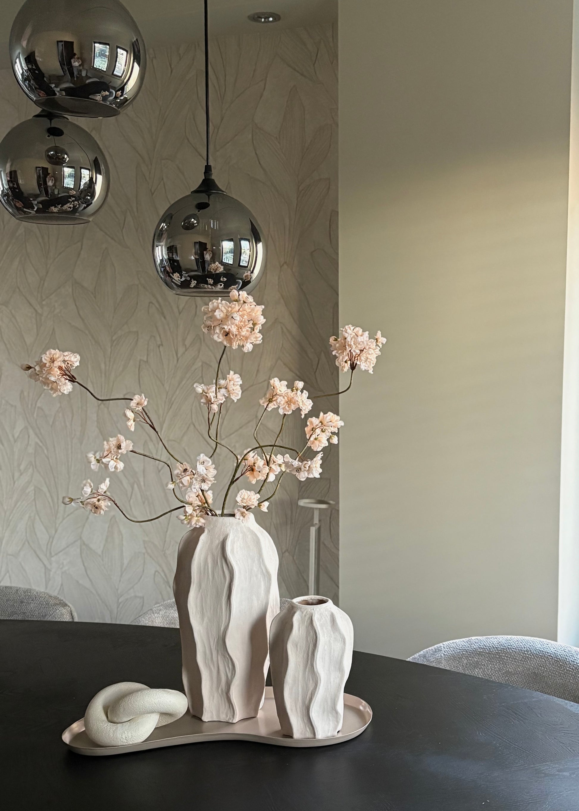 - Op de eettafel: Plaats het dienblad in het midden van de tafel en combineer het met een een grotere of drie vazen van verschillende hoogtes in neutrale kleuren. Voeg zijdenbloesemtakken toe aan je vazen, of een kleurrijk zijdenbloemenboeket.