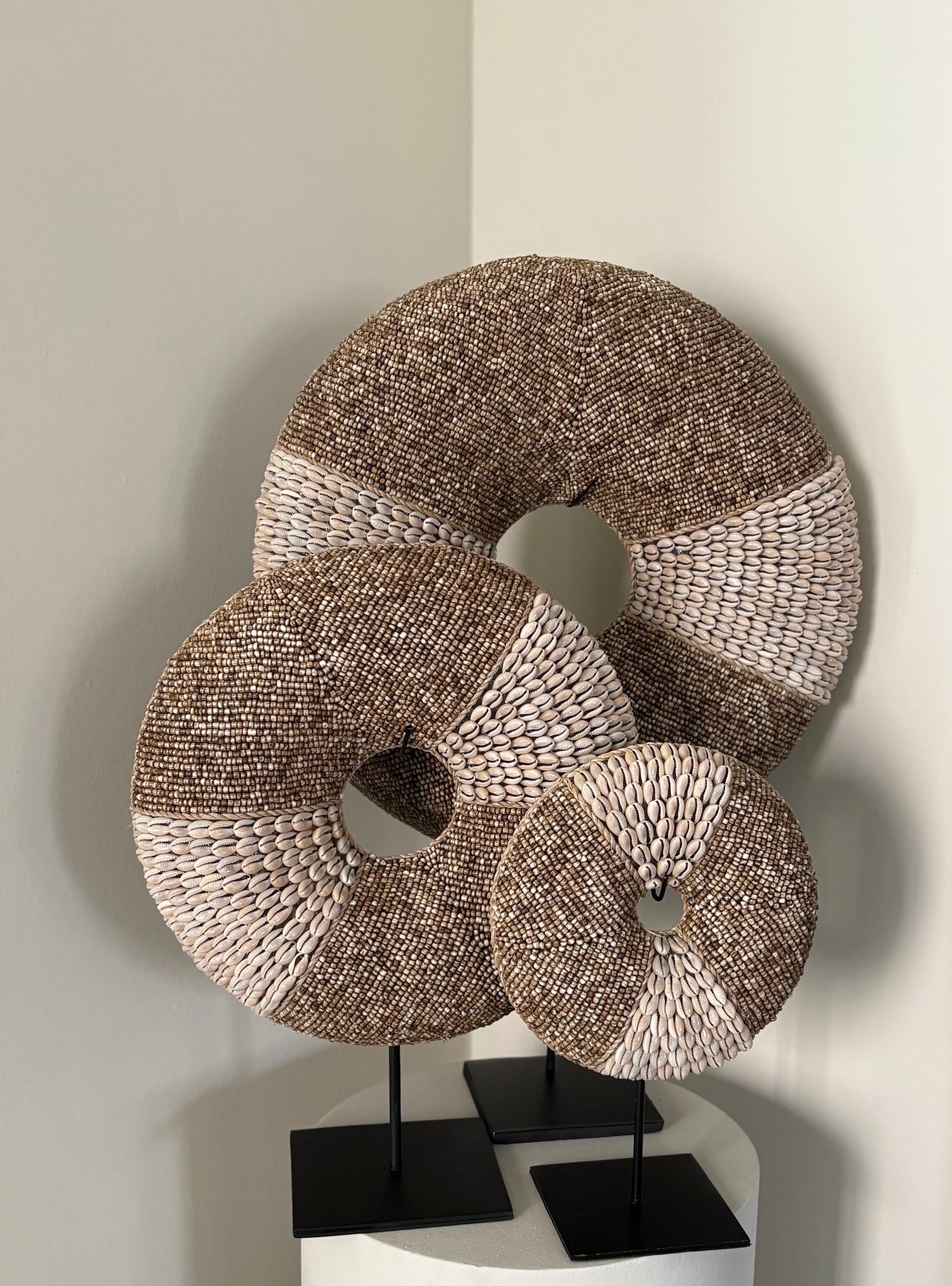 De schelpenornamenten zijn in een cirkelvorm. De cirkel is opgemaakt met licht bruine kralen en kauri schelpen. De standaard is inclusief