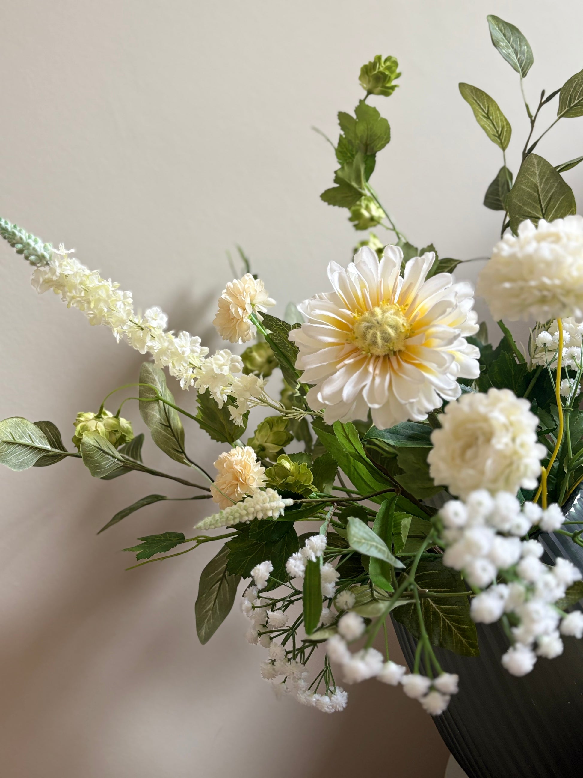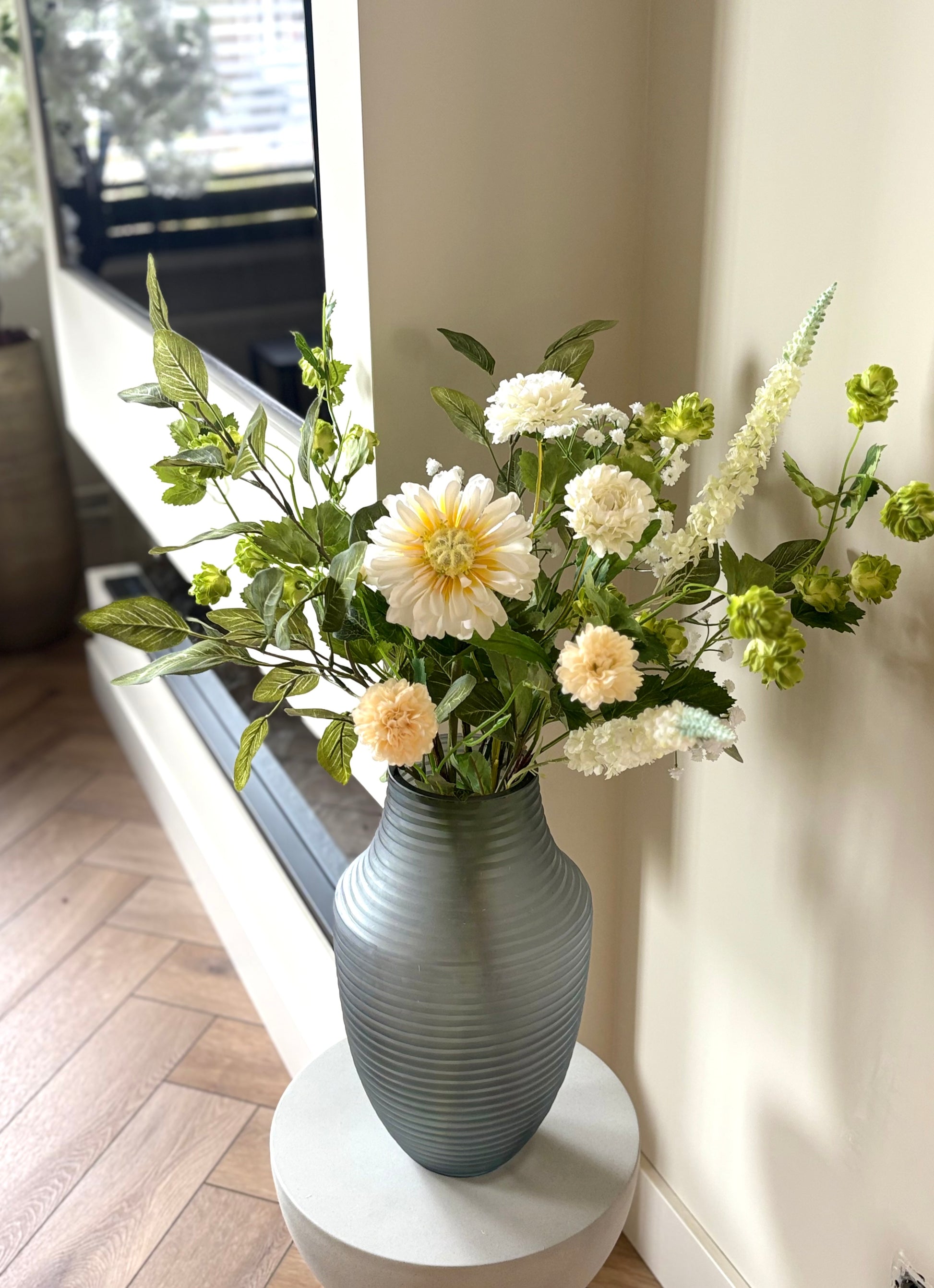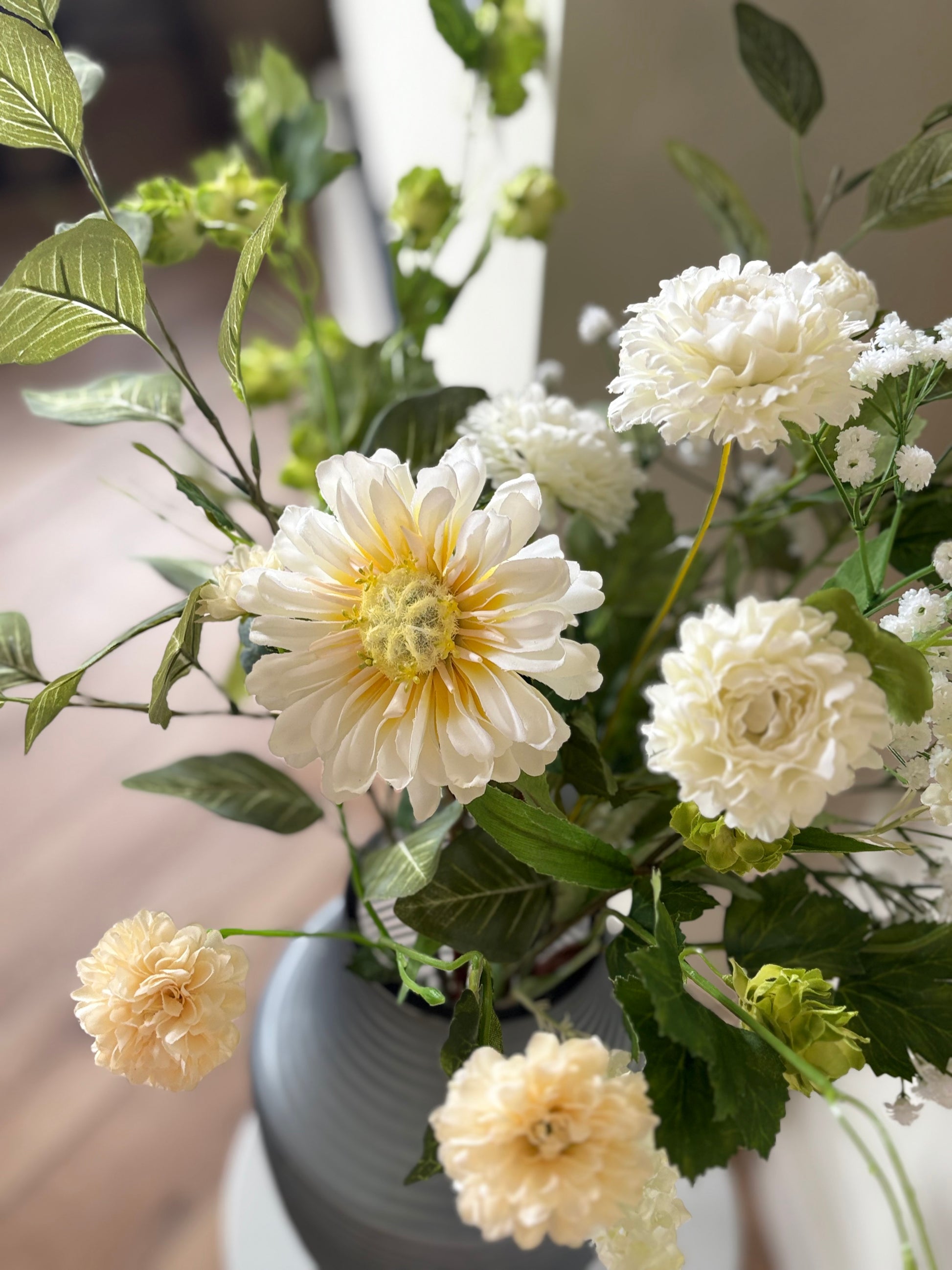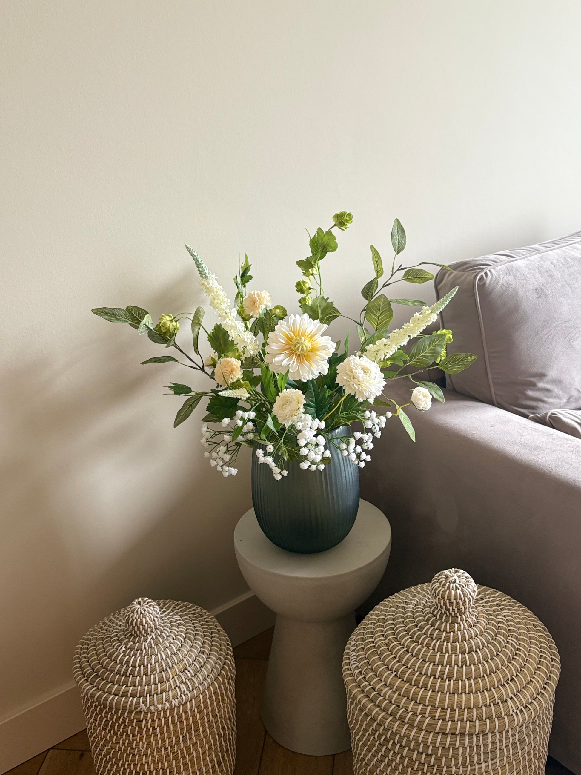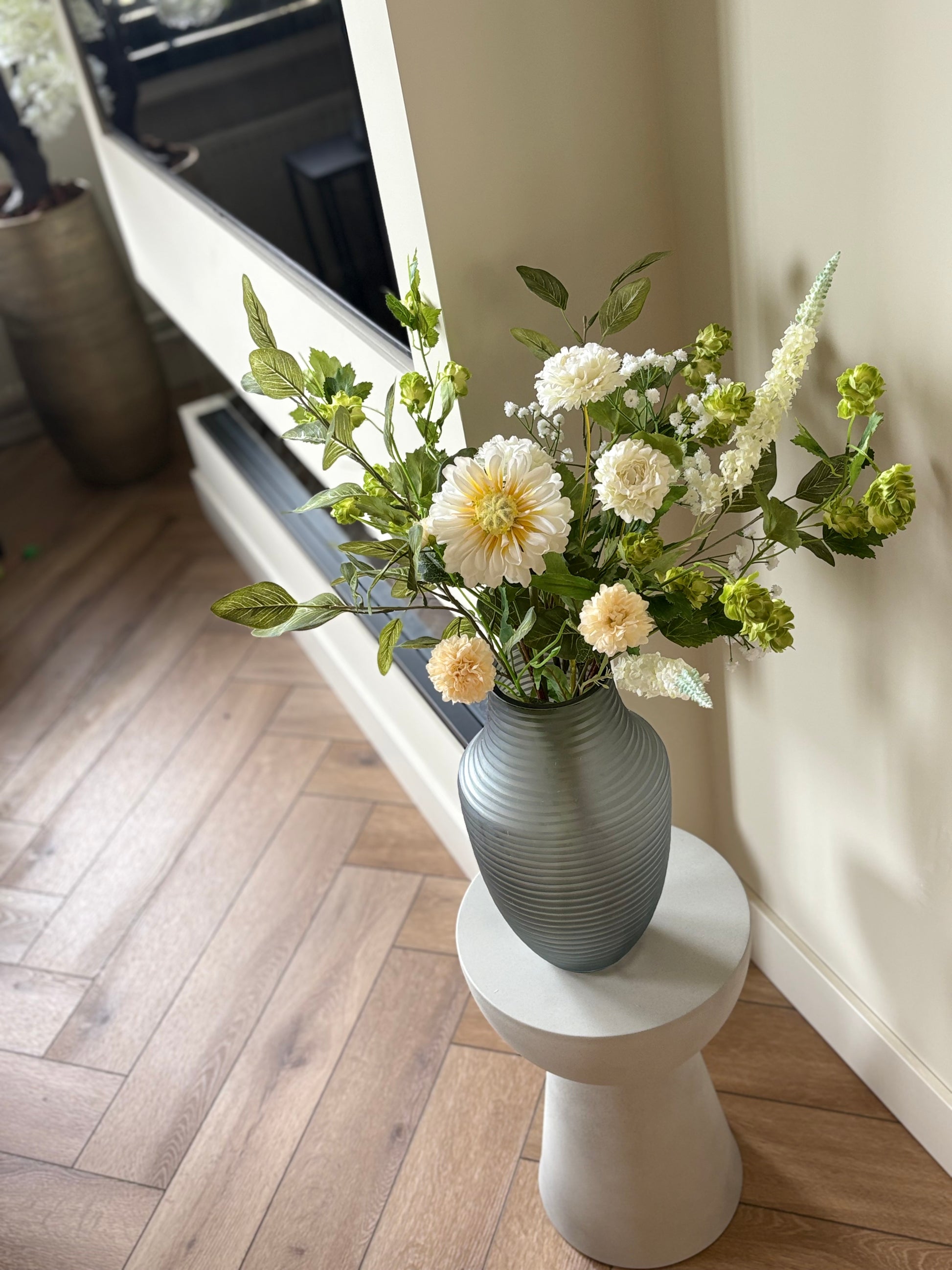 Ben jij op zoek naar een boeket dat jouw Japandi interieur compleet maakt? Dit prachtige zijdenboeket Japandi brengt direct rust, eenvoud en natuurlijke elegantie in jouw Japandi interieur. Het boeket is samengesteld met hoge kwaliteit zijdenbloemen en realistische zijdentakken in zachte groene tinten, gecombineerd met witte zijdenbloemen. Samen vormen ze een rustig boeket dat de minimalistische en serene uitstraling van de Japandi stijl versterkt.