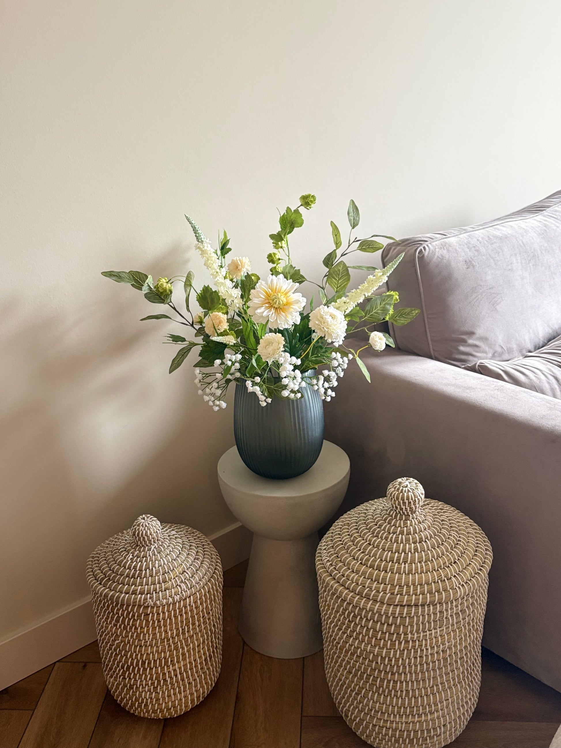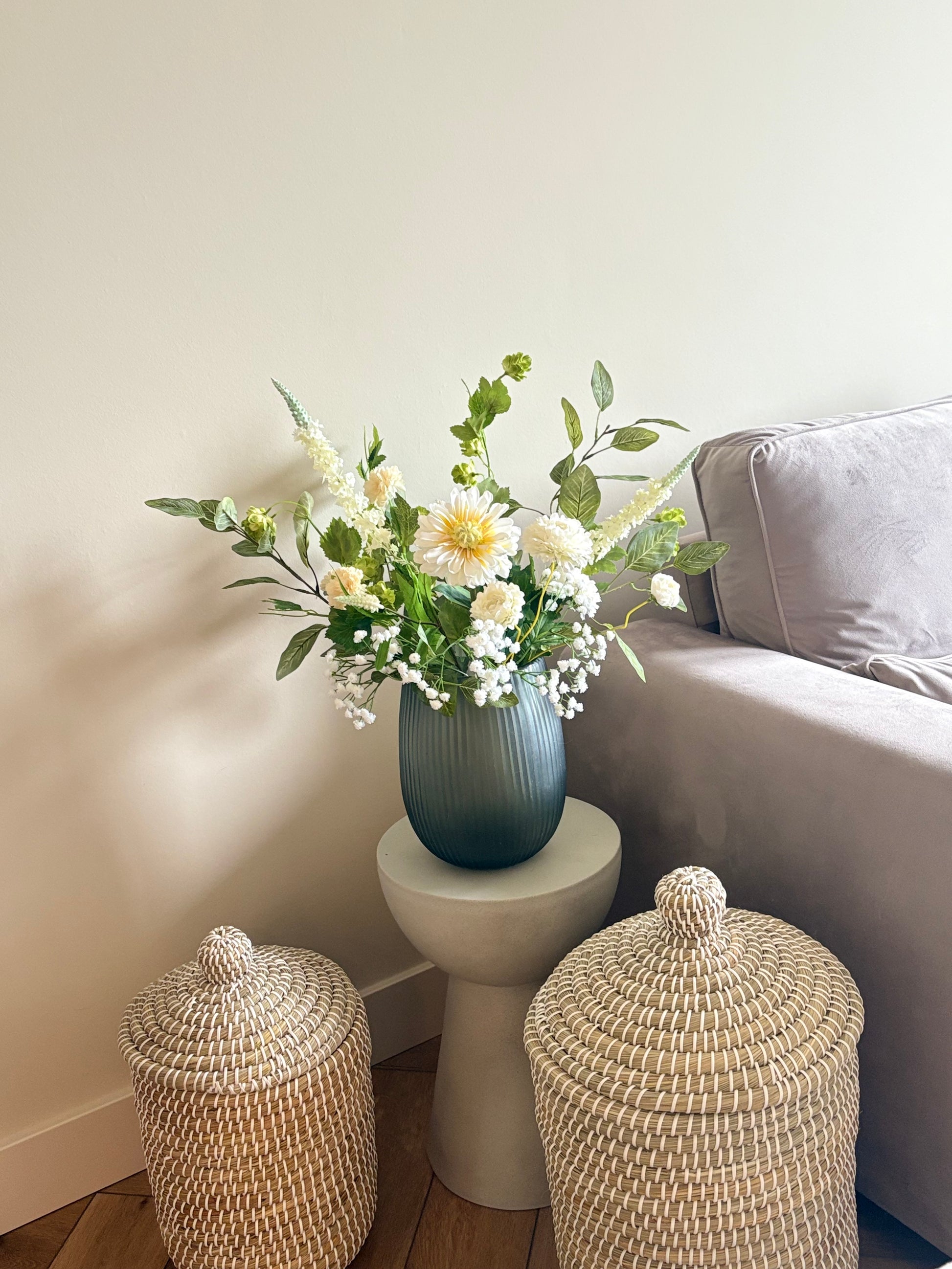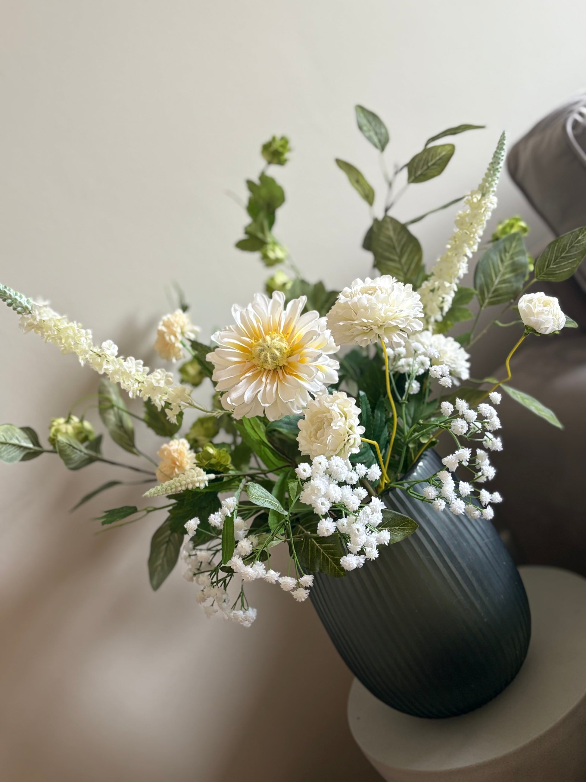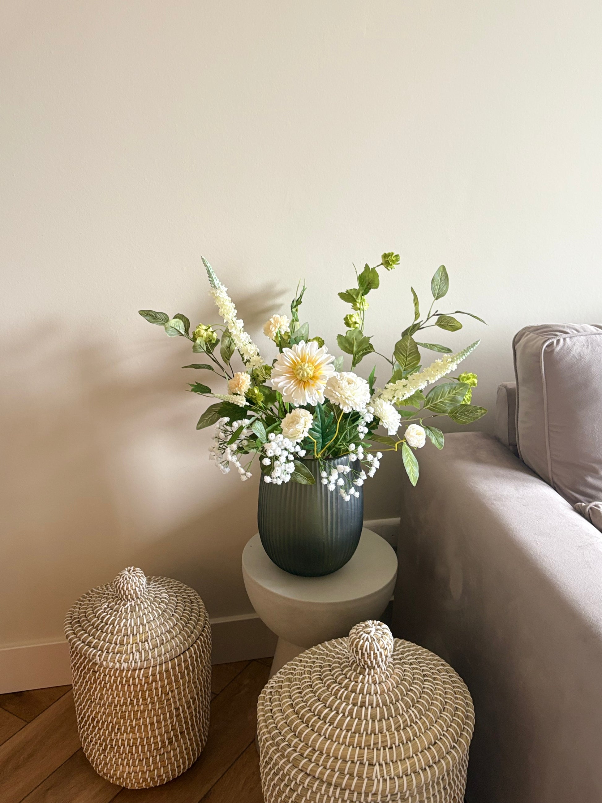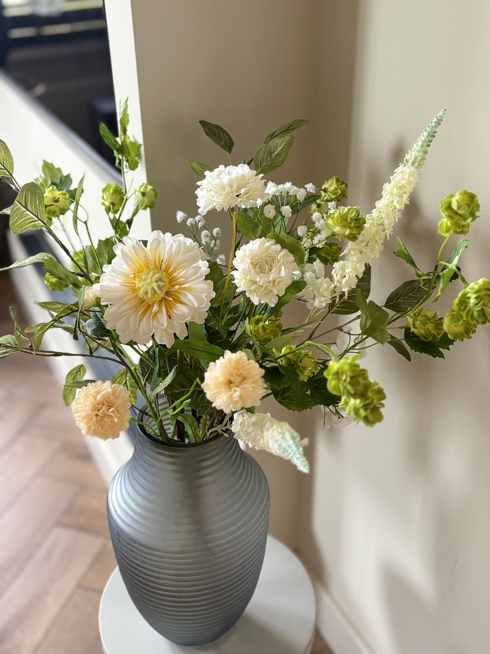 Ben jij op zoek naar een boeket dat jouw Japandi interieur compleet maakt? Dit prachtige zijdenboeket Japandi brengt direct rust, eenvoud en natuurlijke elegantie in jouw Japandi interieur. Het boeket is samengesteld met hoge kwaliteit zijdenbloemen en realistische zijdentakken in zachte groene tinten, gecombineerd met witte zijdenbloemen. Samen vormen ze een rustig boeket dat de minimalistische en serene uitstraling van de Japandi stijl versterkt.