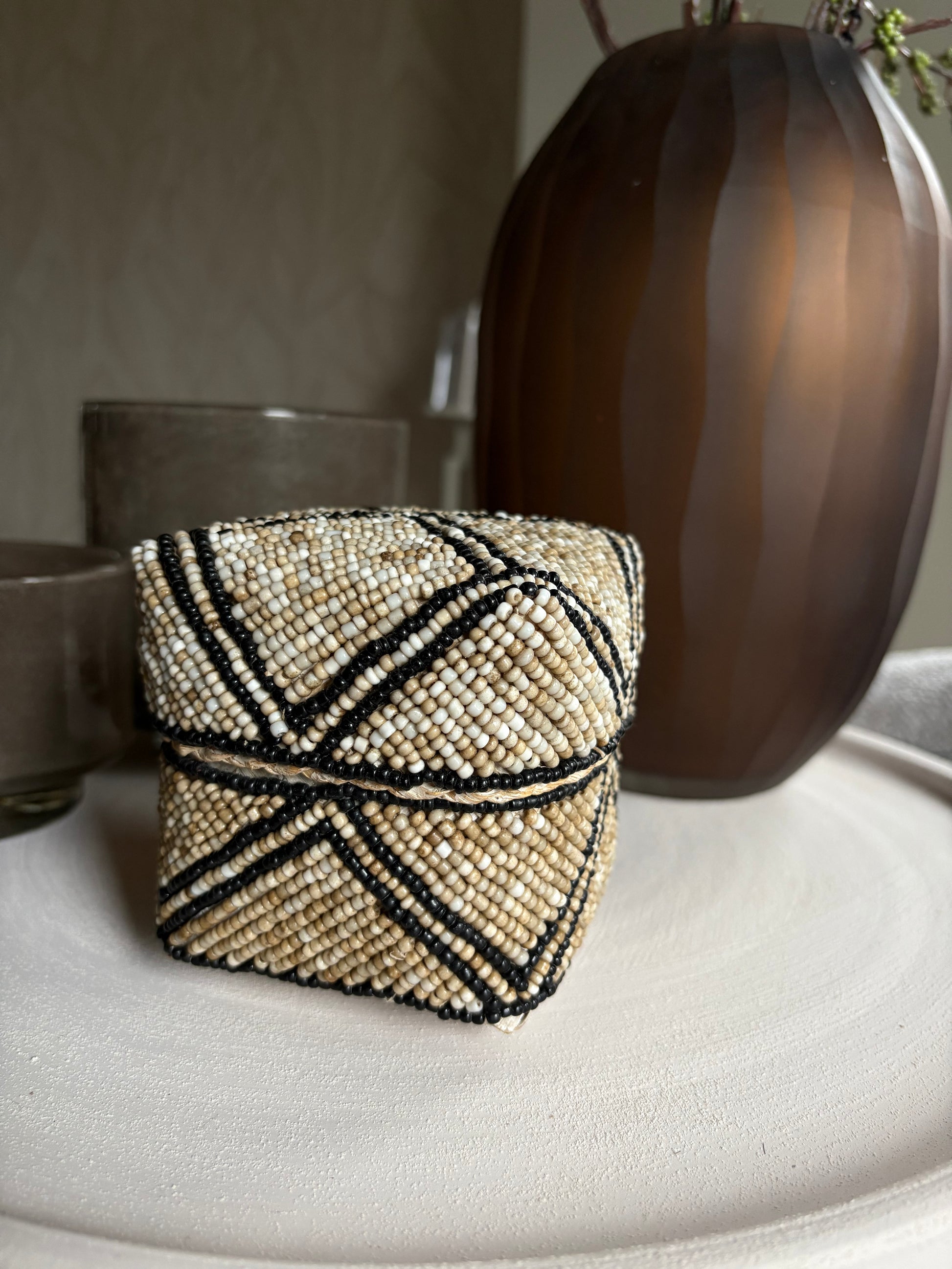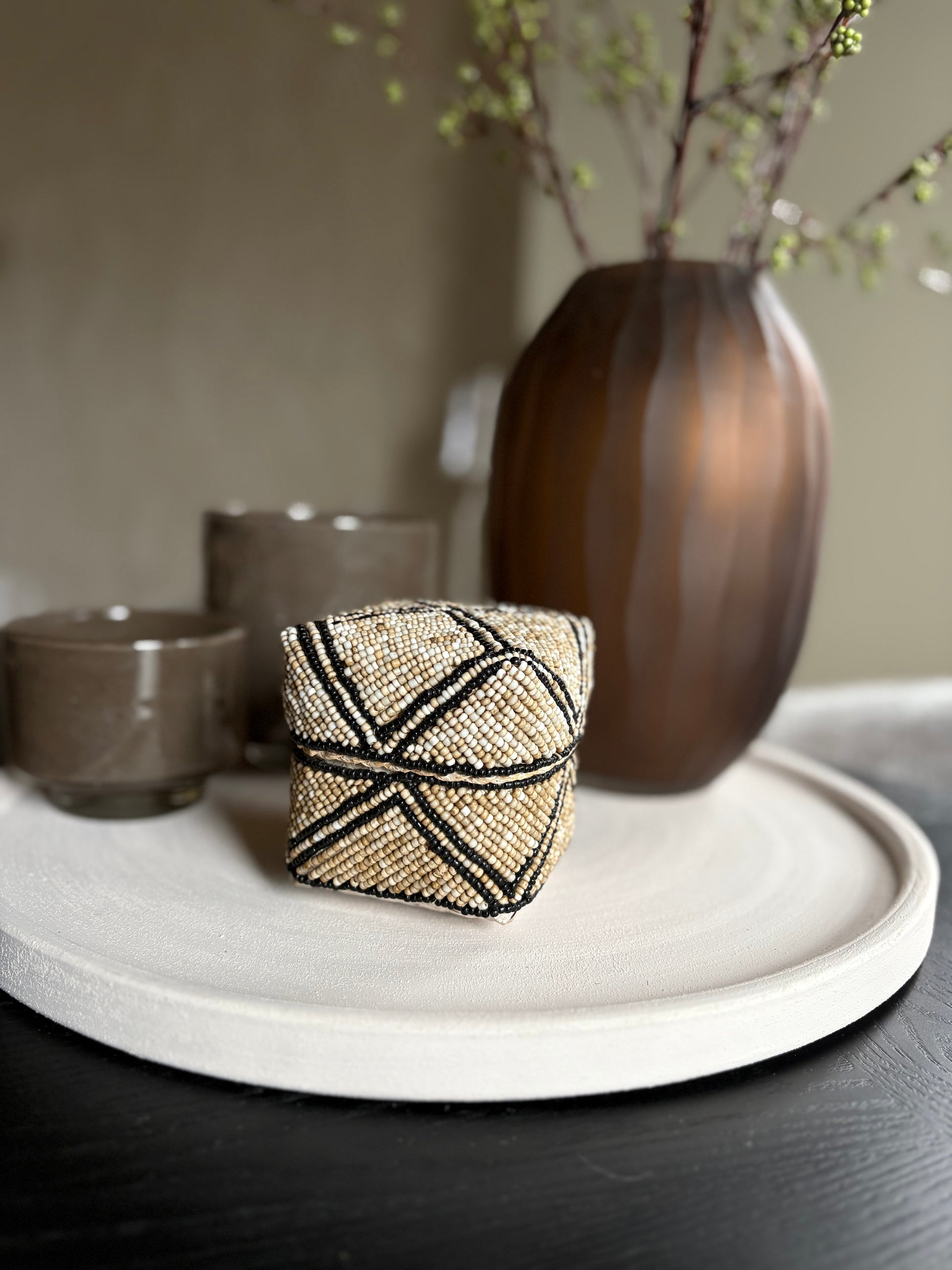 Deze elegante opbergboxen zijn met de hand gevlochten van natuurlijke palmbladeren en volledig versierd met glaskralen. Deze prachtige offermanden zijn de eye catchers voor je interieur, gebruik ter decoratie voor in de vakkenkast, of op een dressoir. Daarnaast is het een stijlvolle manier om kleine items in op te bergen!