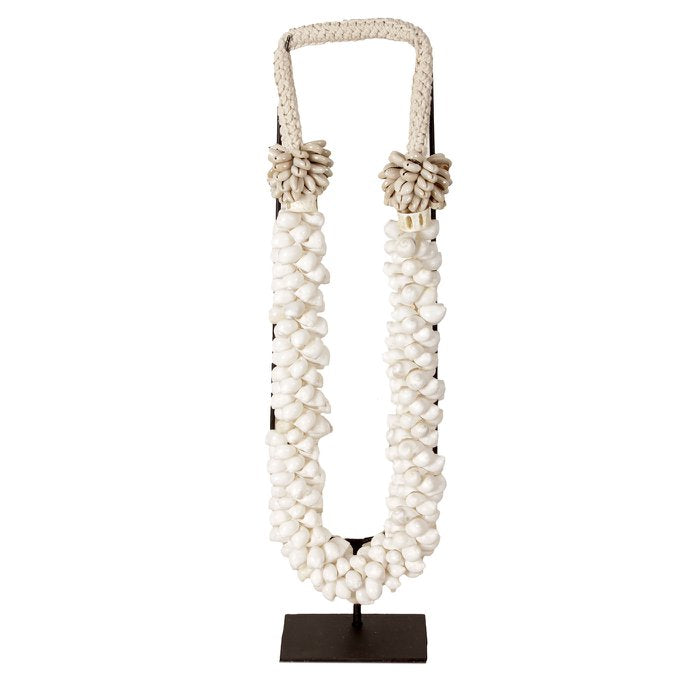 Omarm de essentie van Indonesië met onze handgemaakte schaalketting, elegant weergegeven op een unieke metalen standaard. Elke ketting is gemaakt van zorgvuldig geselecteerde zeeschelpen, gepolijst door de oceaan, en ingewikkeld geweven in ontwerpen geïnspireerd door het rijke culturele erfgoed van de Indonesische archipel. Perfect als een decoratief accent, deze kettingen brengen de natuurlijke schoonheid en traditie van Indonesië in uw huis.