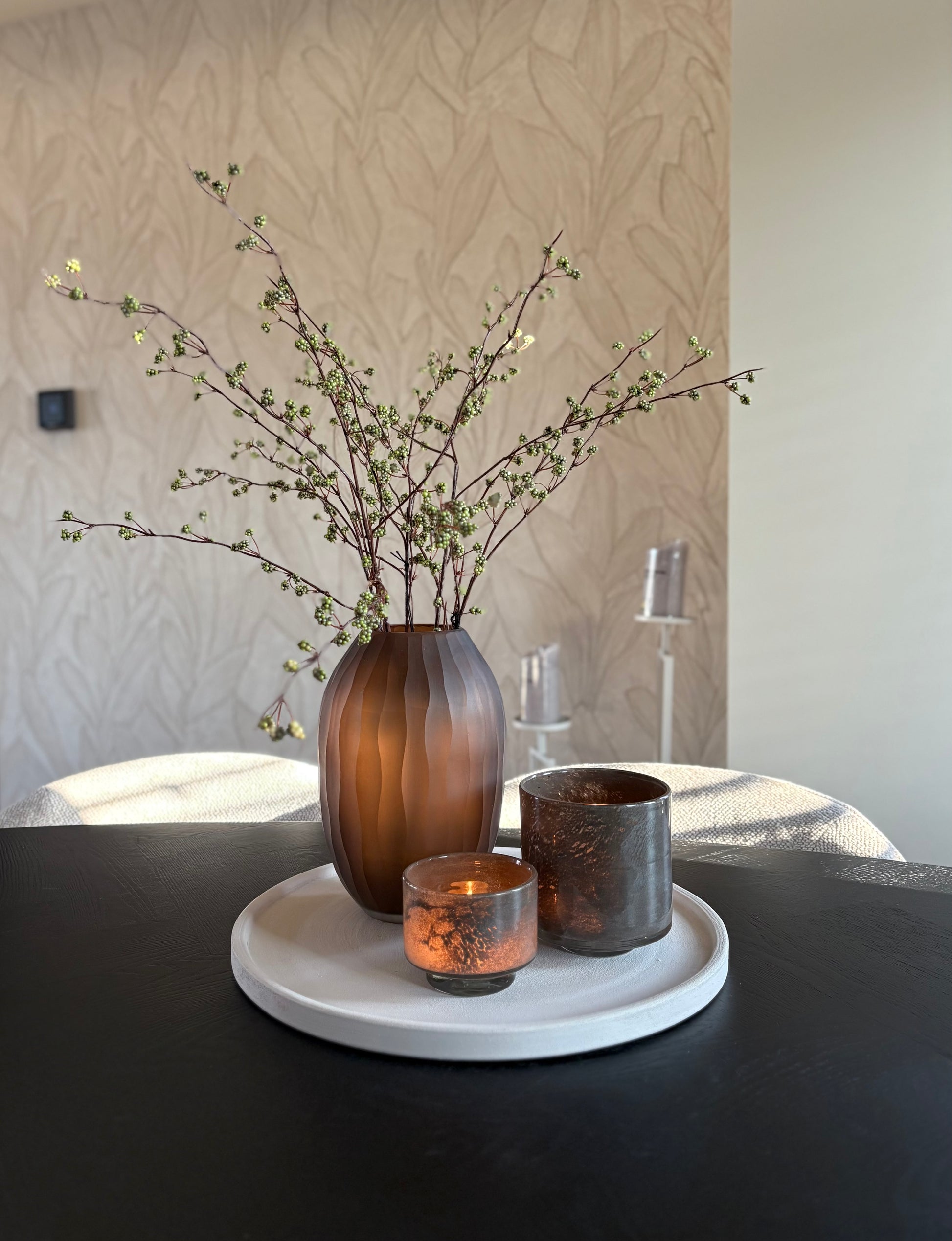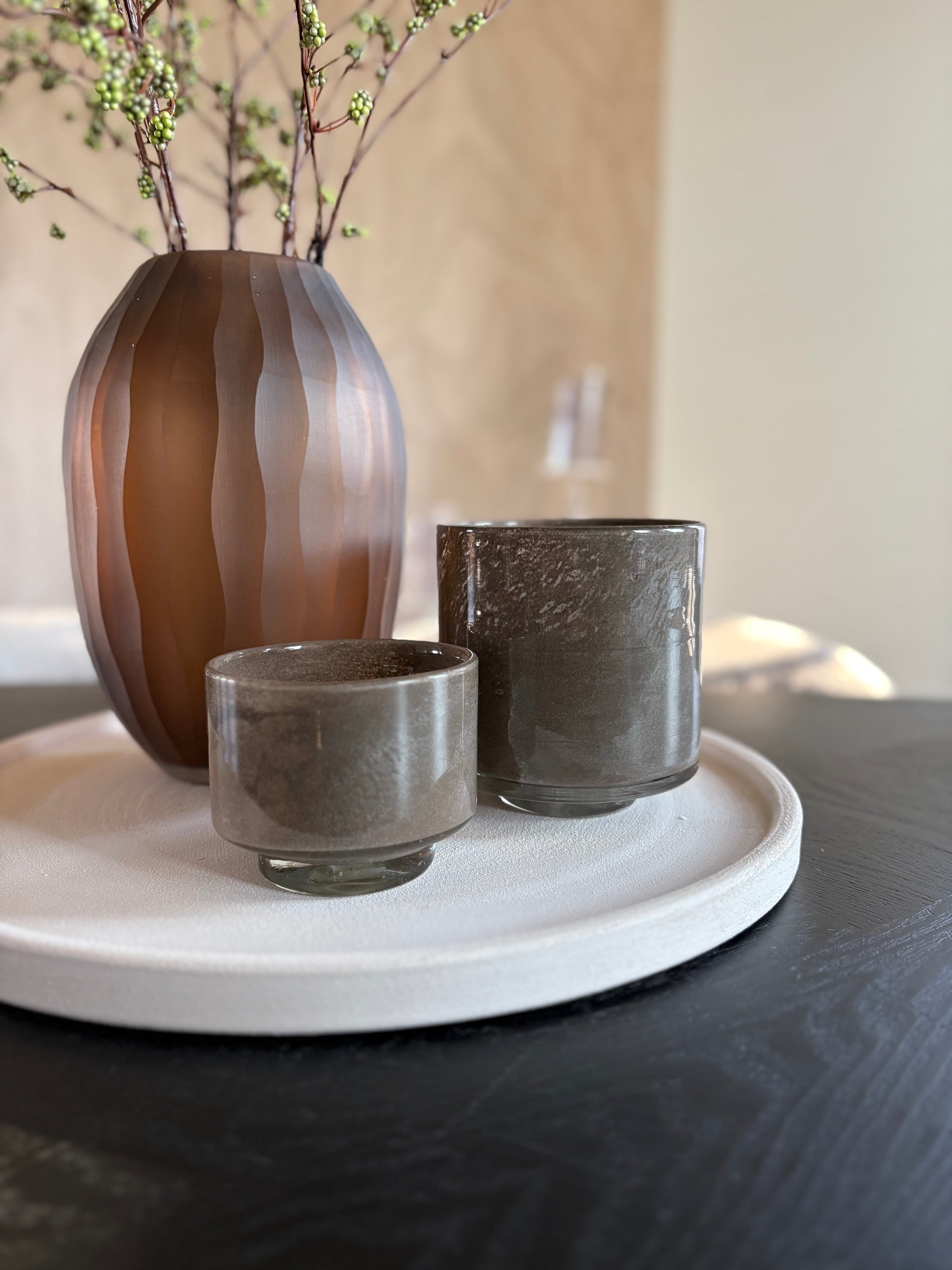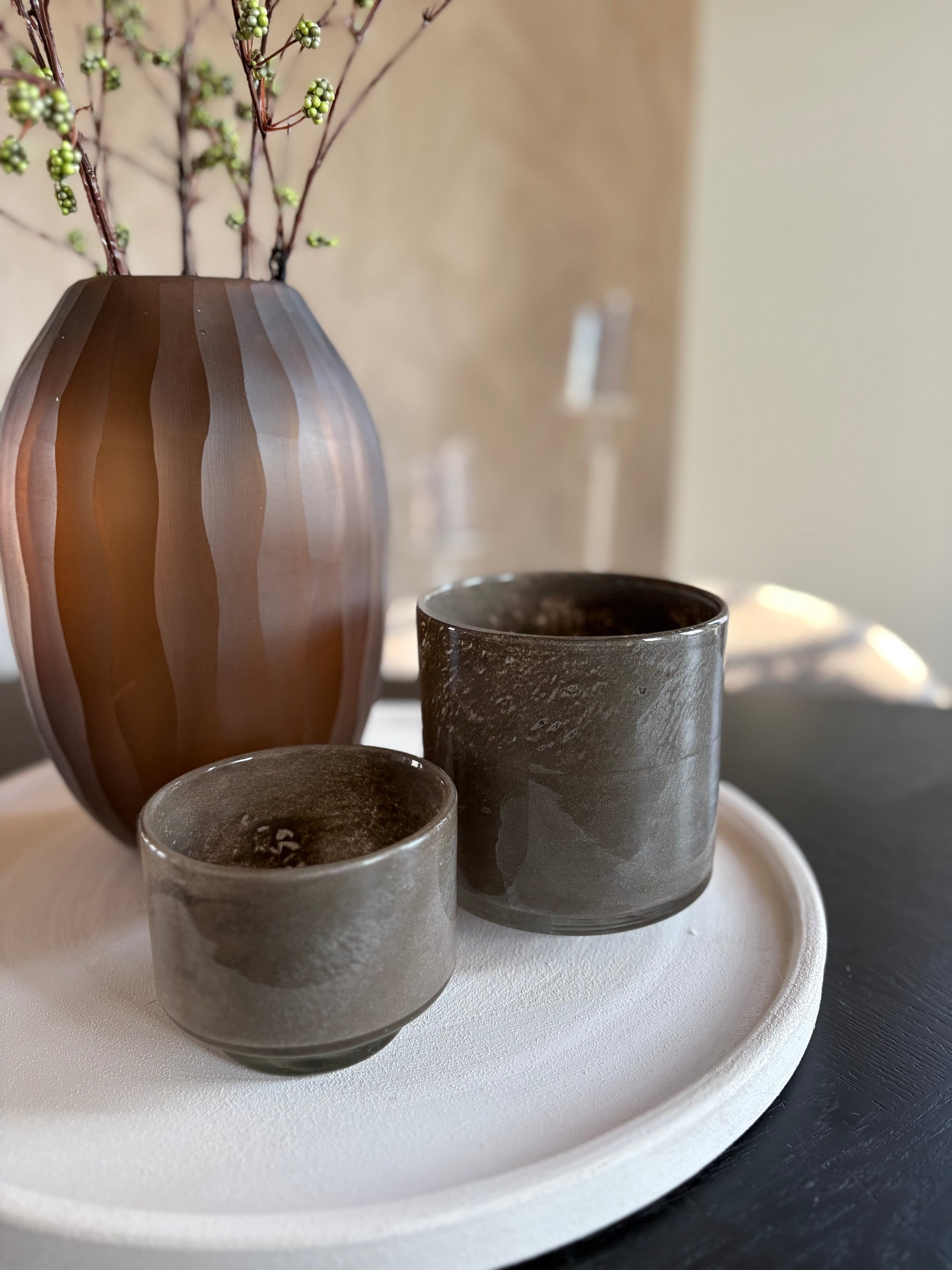 Deze prachtige grote waxinelichthouders hebben een wat gevlekt uiterlijk. Ze hebben een mooie bruine kleur, en geven sfeervol licht. De waxinelichthouders zijn van dik glas.