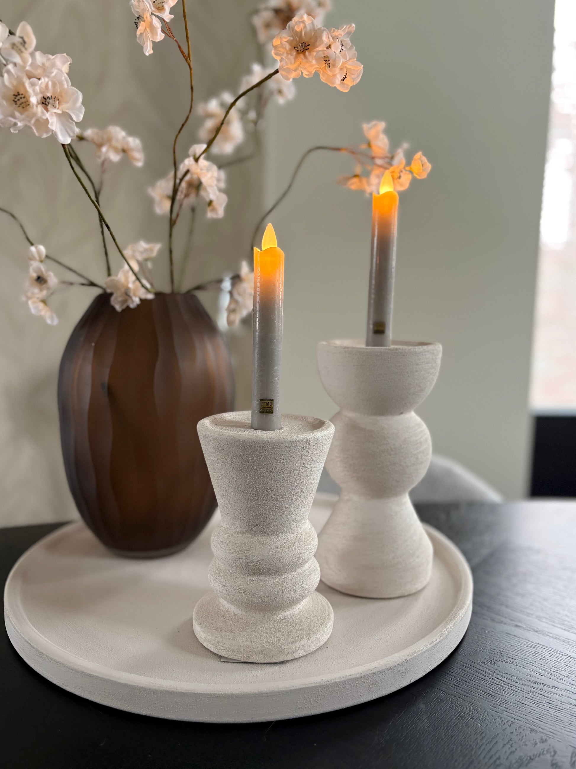 Prachtige aardewerk kandelaren in een licht beige kleur, verkrijgbaar in drie maten. De kandelaren zijn sfeervol met elkaar te combineren, in een set van drie of twee. Breng een rustgevende sfeer in huis, combineer de kandelaren met onze PTMD led kaarsen en geniet van de set in je interieur!