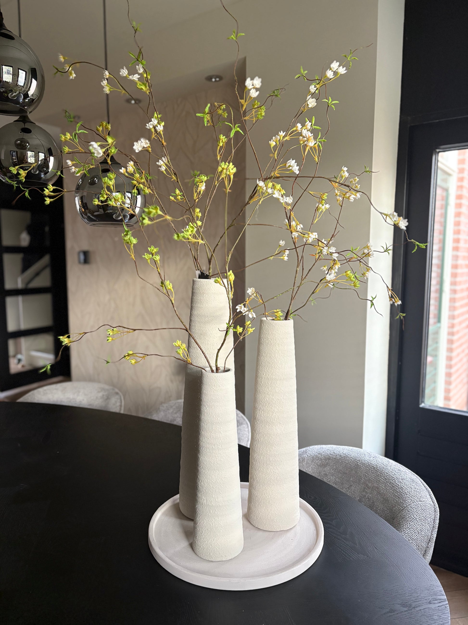 Deze Japandi vaas maakt deel uit van een set van drie verschillende hoogtes, zodat je kunt spelen met de plaatsing en afmetingen in je interieur. Combineer de verschillende formaten voor een dynamisch effect, bijvoorbeeld op je dressoir, salontafel of eettafel. De variatie in hoogtes creëert een mooie visuele balans en voegt diepte toe aan je ruimte. Zet de vaas neer als een set of gebruik hem als statement stuk naast andere decoratieve elementen.