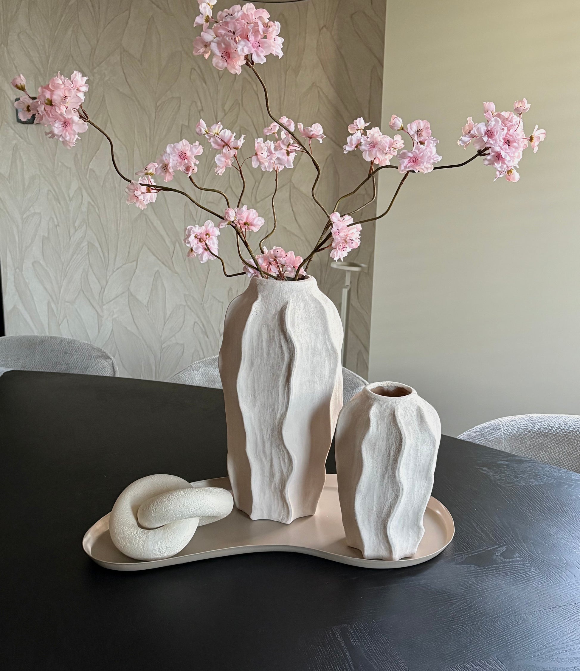 Combineer de lichtroze zijdenbloesem met een aardewerk vaas in een natuurlijke tint zoals beige of taupe. Combineer de zijdenbloesemtakken met onze Japandi vazen uit de collectie. Een perfecte combinatie van rust en stijl.