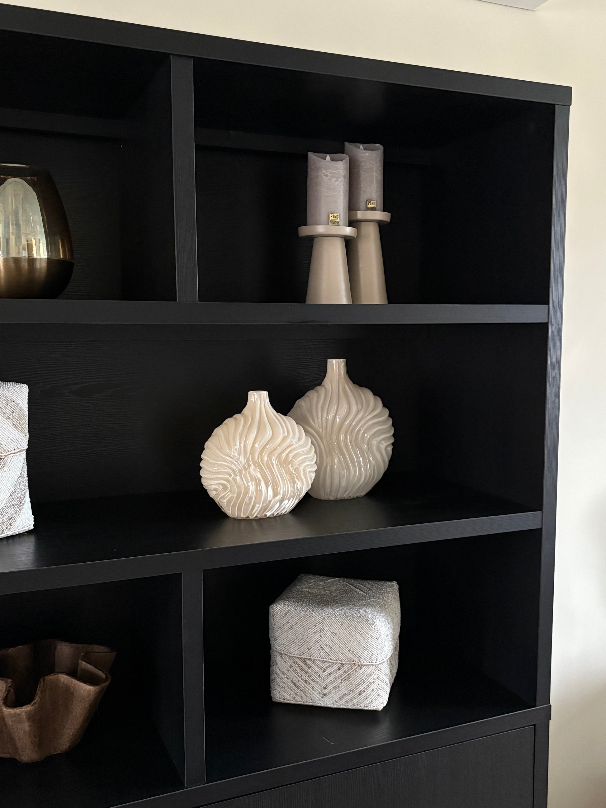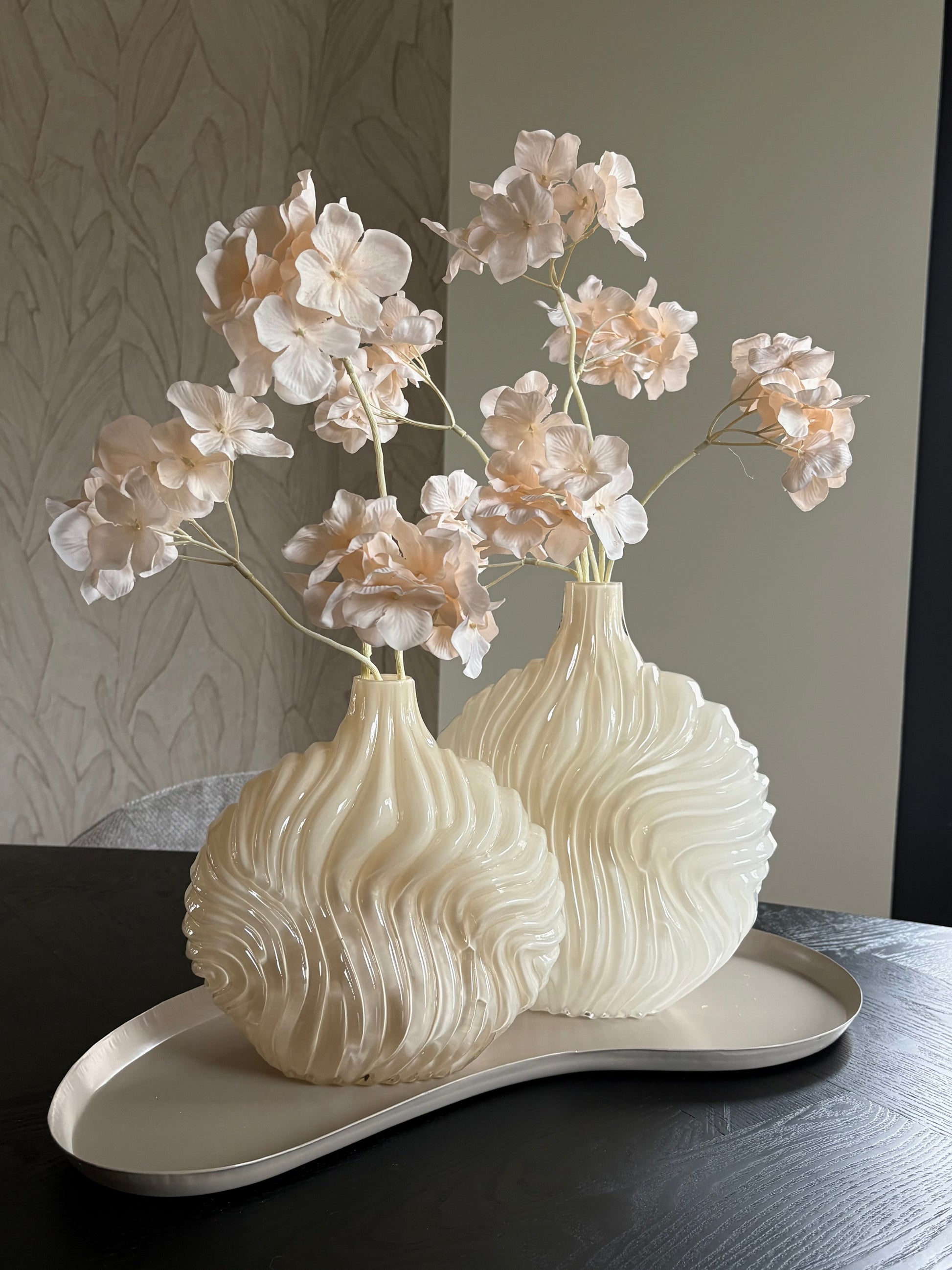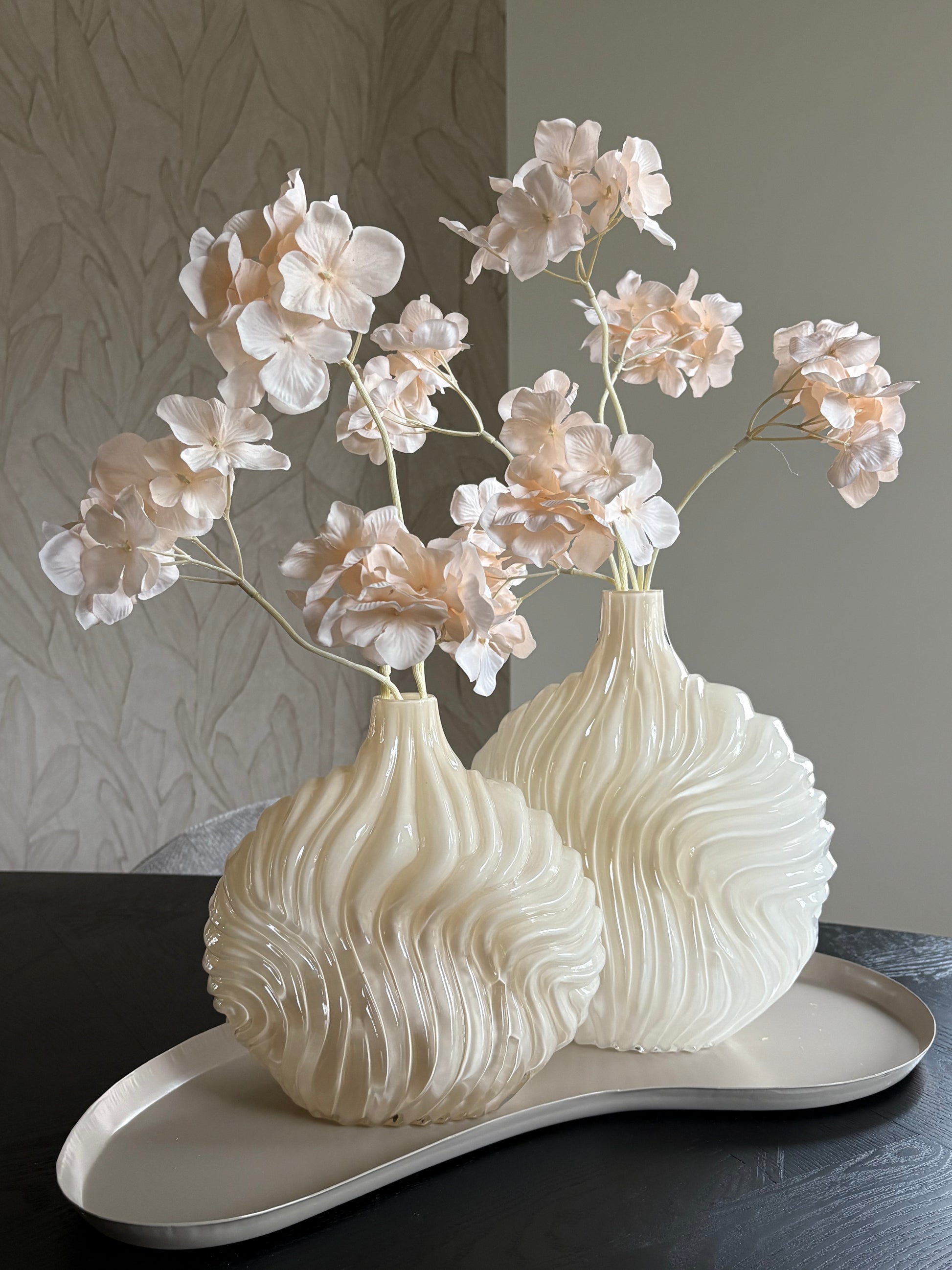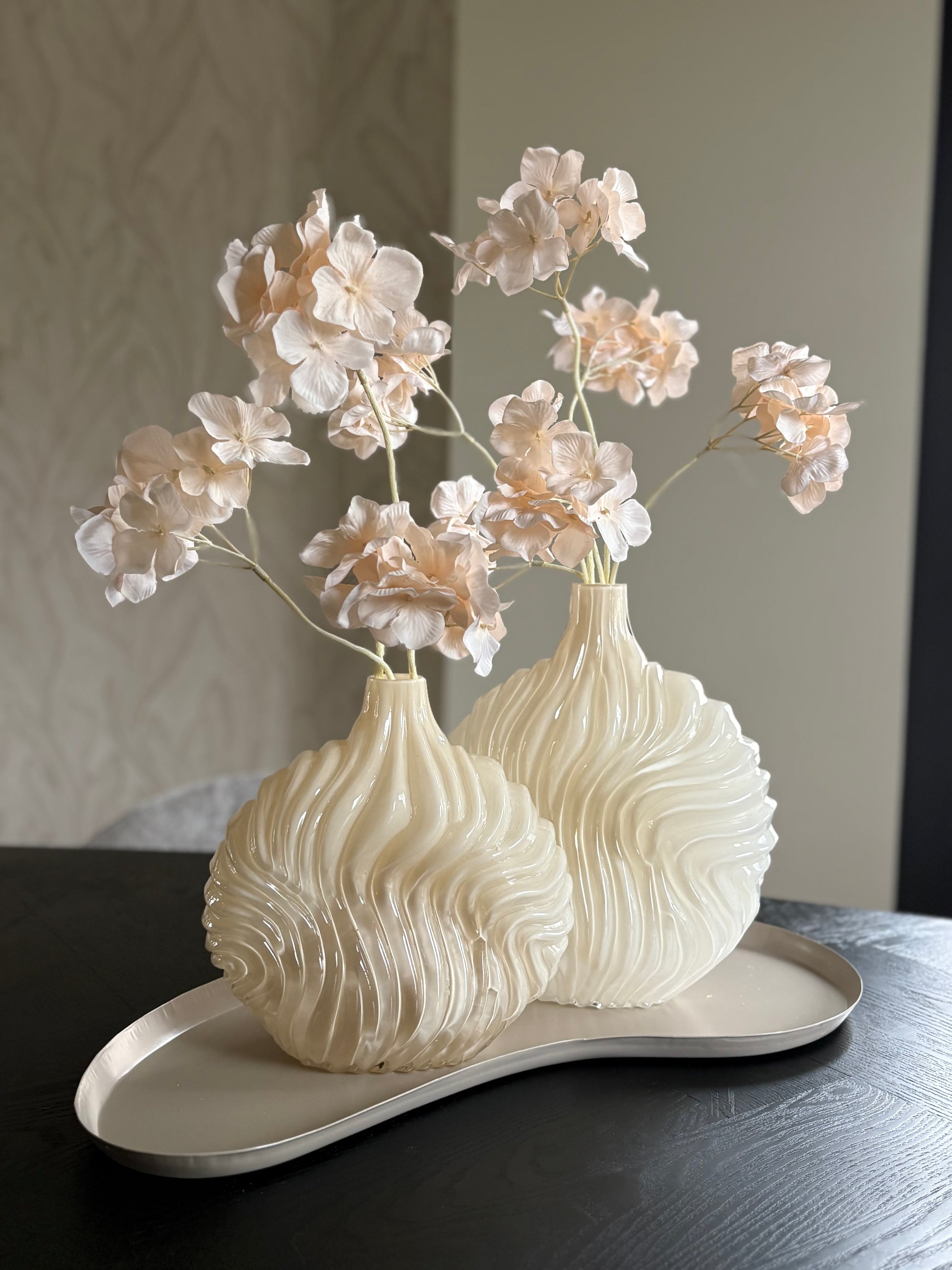 Prachtige luxe vazen in een mooie creme kleur. De vazen hebben een rond uiterlijk en een wave patroon. De Kelline vazen zijn een chique toevoeging aan je interieur, perfect voor de vakkenkast, eettafel of op de salontafel! De Kelline vazen zijn gemaakt van glas. En verkrijgbaar in twee maten: