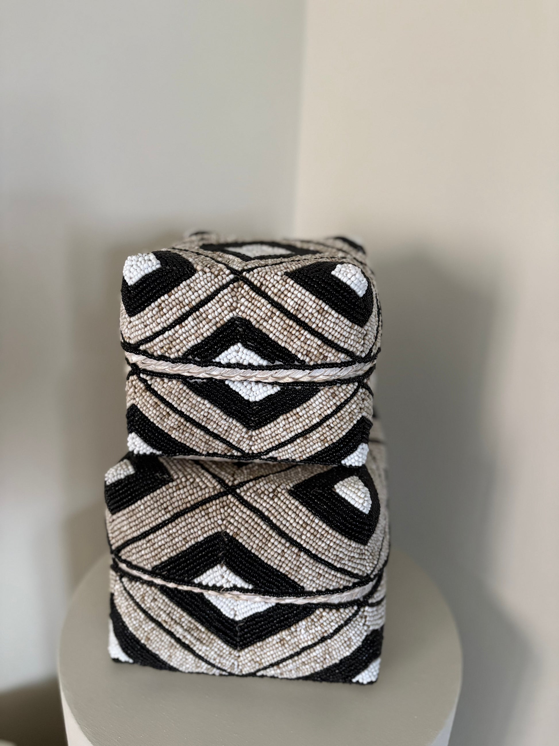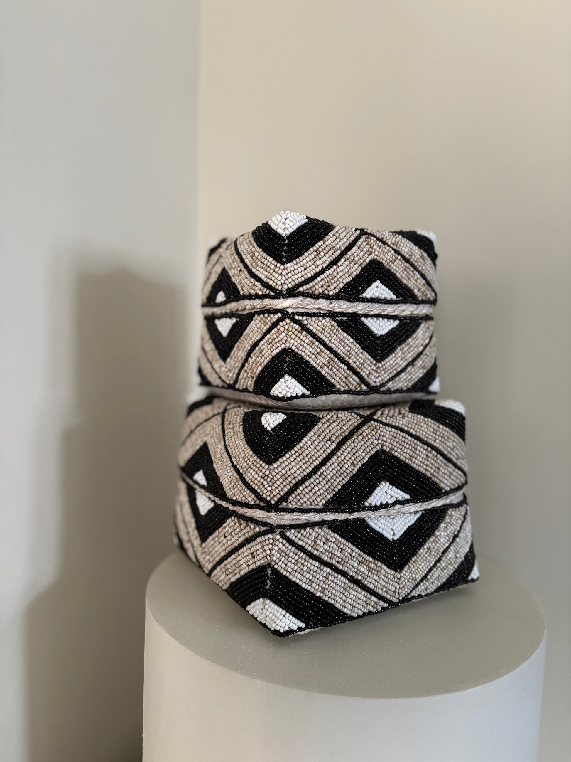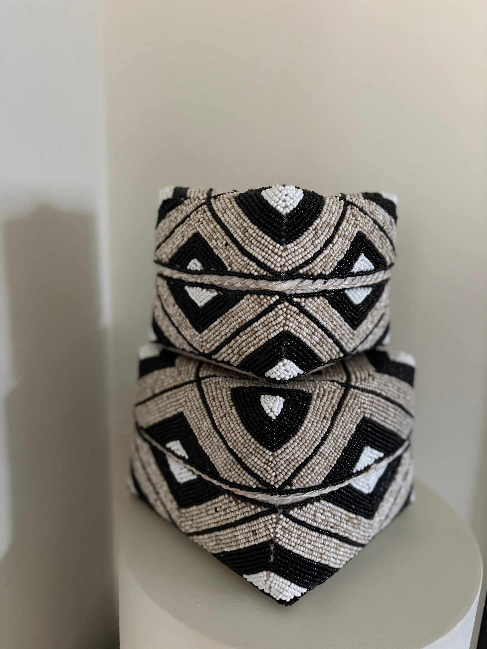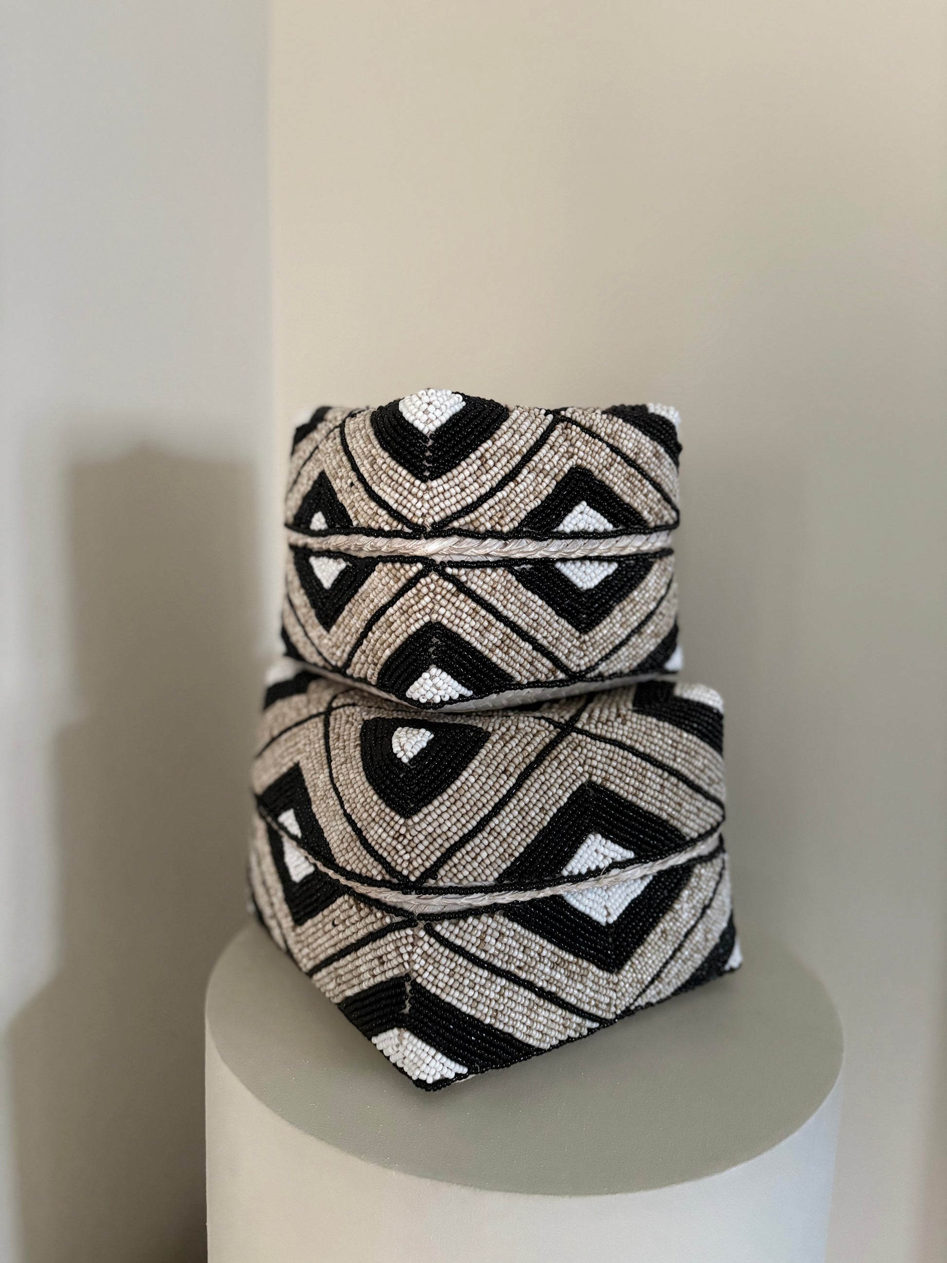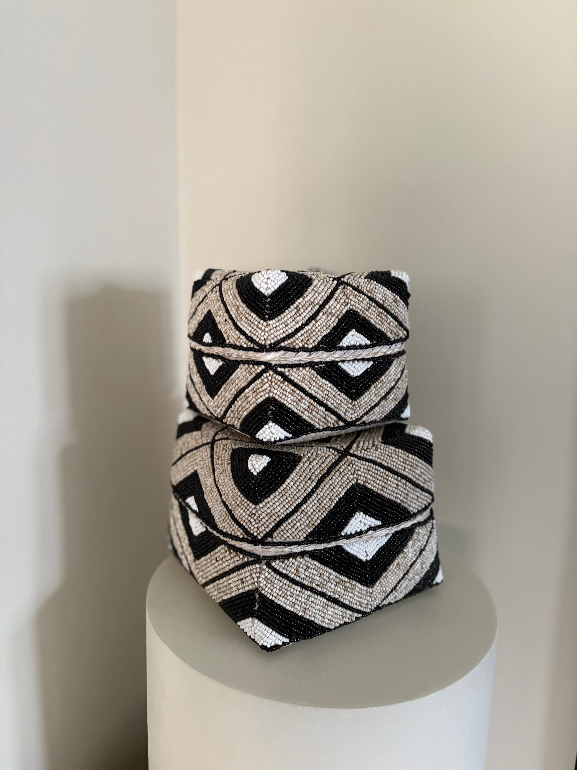 Deze elegante opbergboxen zijn met de hand gevlochten van natuurlijke palmbladeren en volledig versierd met glaskralen. Deze prachtige offermanden zijn de eye catchers voor je interieur, gebruik ter decoratie voor in de vakkenkast, of op een dressoir. Daarnaast is het een stijlvolle manier om kleine items in op te bergen!