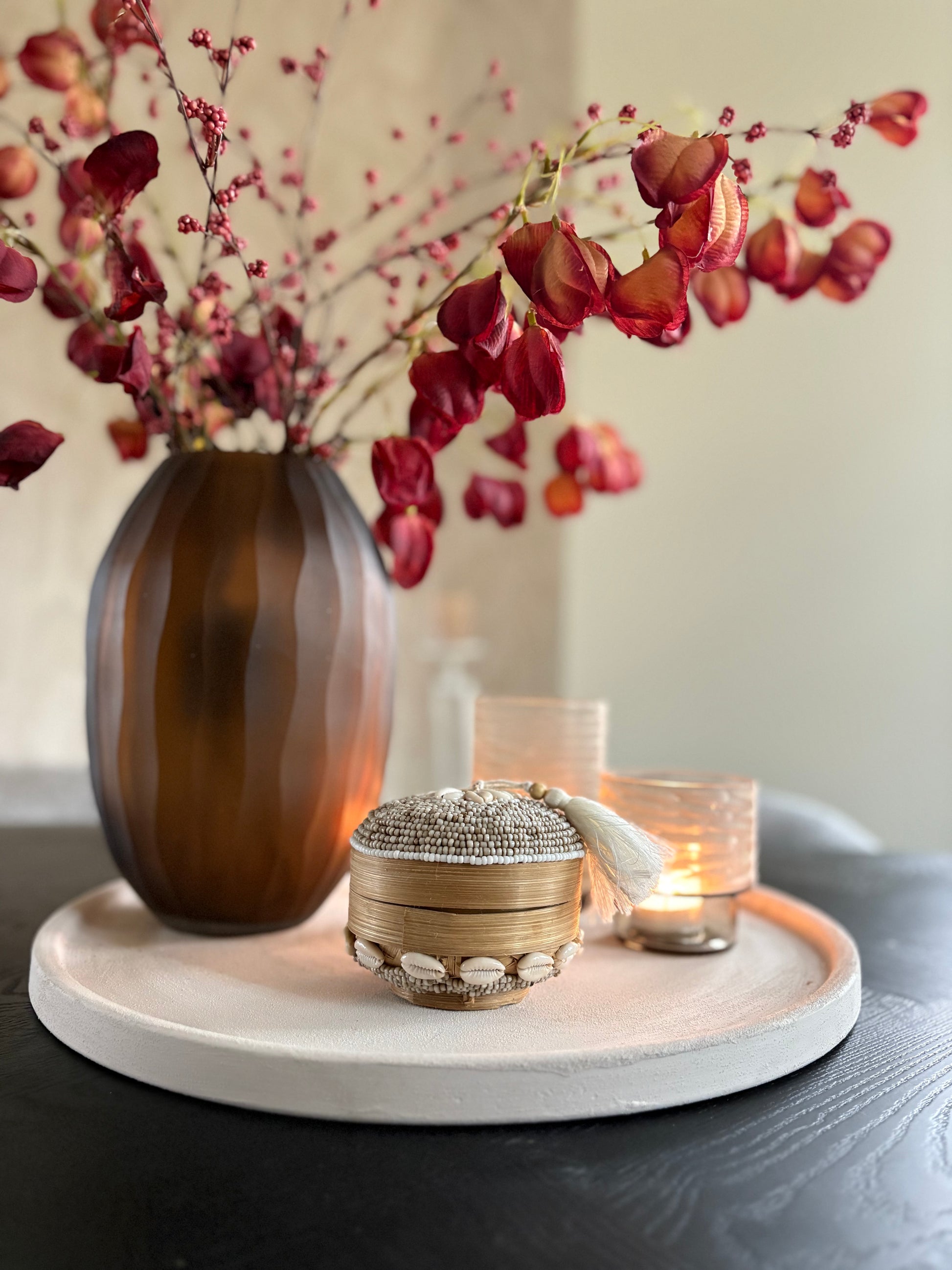 Deze prachtige offermanden afkomstig uit Indonesië zijn volledig met de hand gemaakt, het zijn dus echte unieke items. Deze leuke mandjes zijn gedecoreerd met kralen in een beige kleur en met schelpjes. De manden zijn leuk te combineren op een dienblad, of in een vakkenkast.