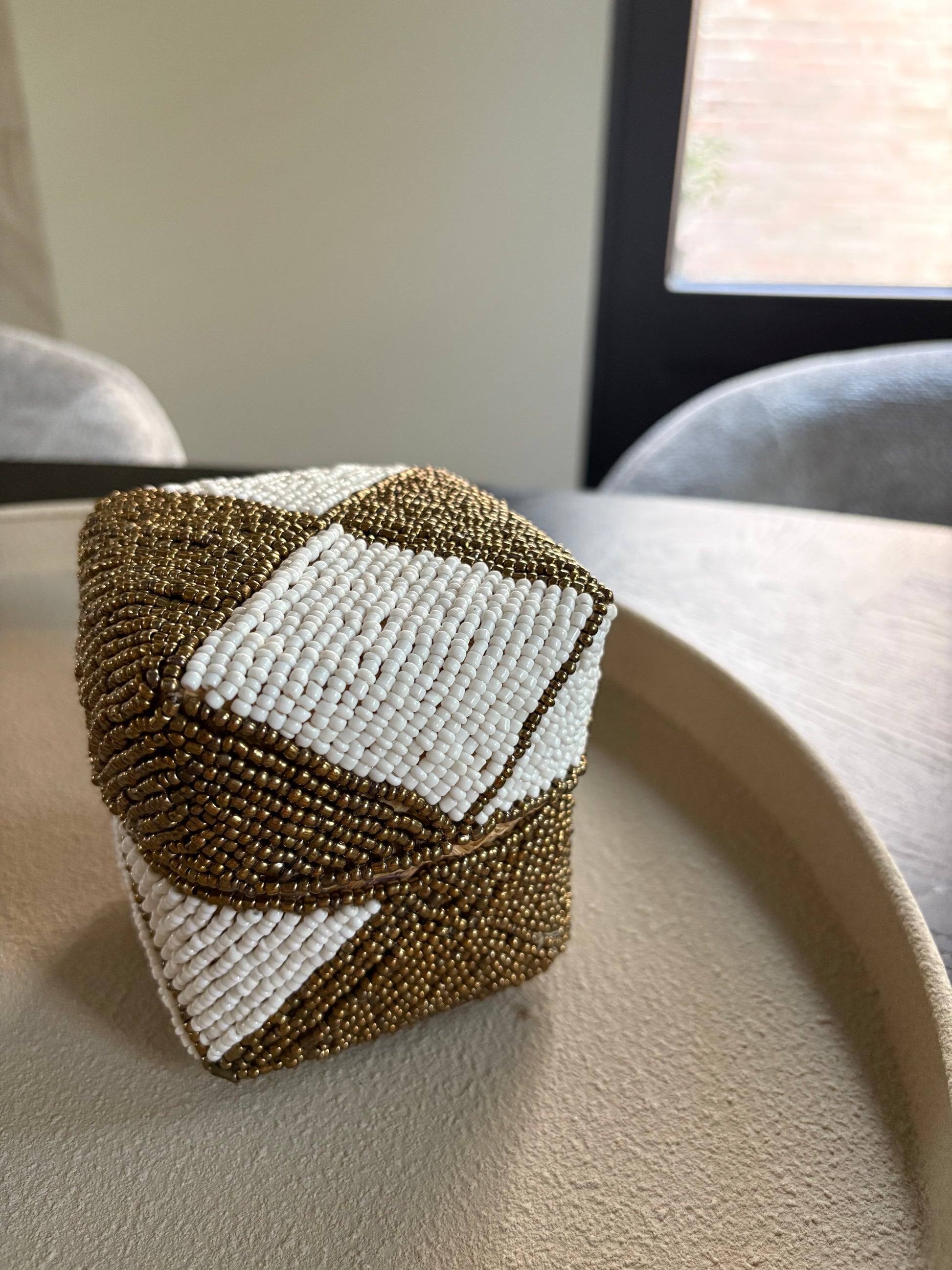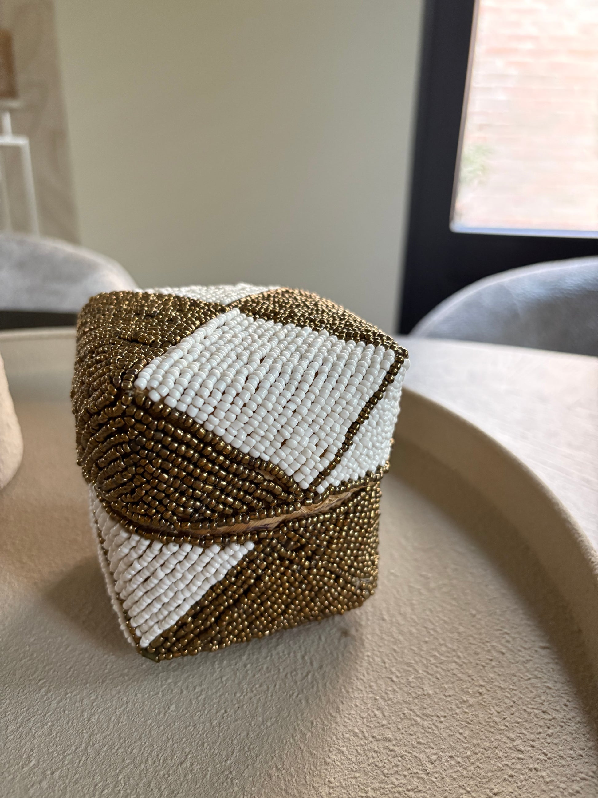 Deze elegante opbergbox is met de hand gevlochten van natuurlijke palmbladeren en volledig versierd met glaskralen kralen. Perfect voor het bewaren van kleine sieraden, als geschenkverpakking of als decoratief accent op een plank of tafel.