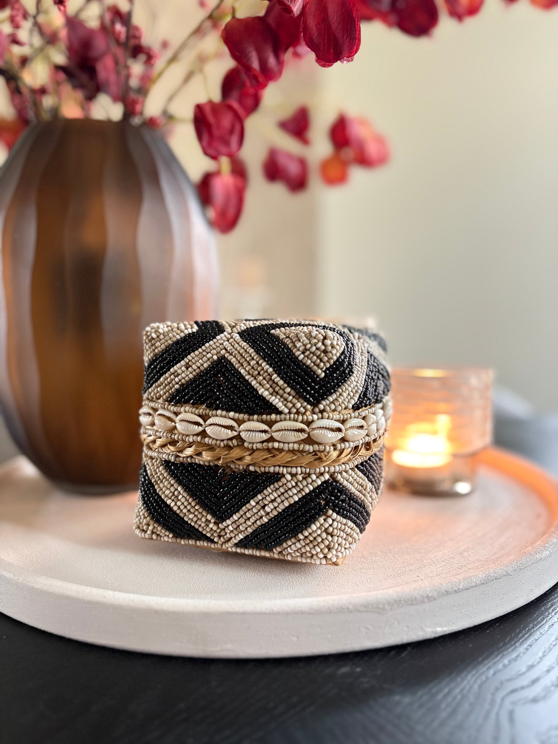 Deze elegante opbergboxen zijn met de hand gevlochten van natuurlijke palmbladeren en volledig versierd met glaskralen. Deze prachtige offermanden zijn de eye catchers voor je interieur, gebruik ter decoratie voor in de vakkenkast, of op een dressoir. Daarnaast is het een stijlvolle manier om kleine items in op te bergen!