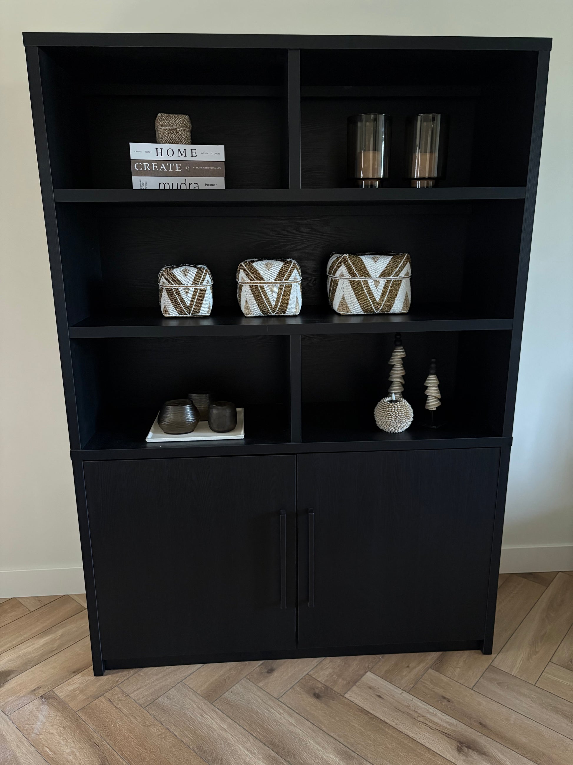 Een populaire manier om offermanden te gebruiken in huis is door ze te stylen in een vakkenkast. De symmetrie van de kast en de ronde vormen van de manden zorgen voor een spannend contrast. Kies bijvoorbeeld voor een set offermanden in verschillende groottes en kleuren – denk aan beige, crème en goud – en creëer een stijlvol statement in je woonkamer, hal of slaapkamer.