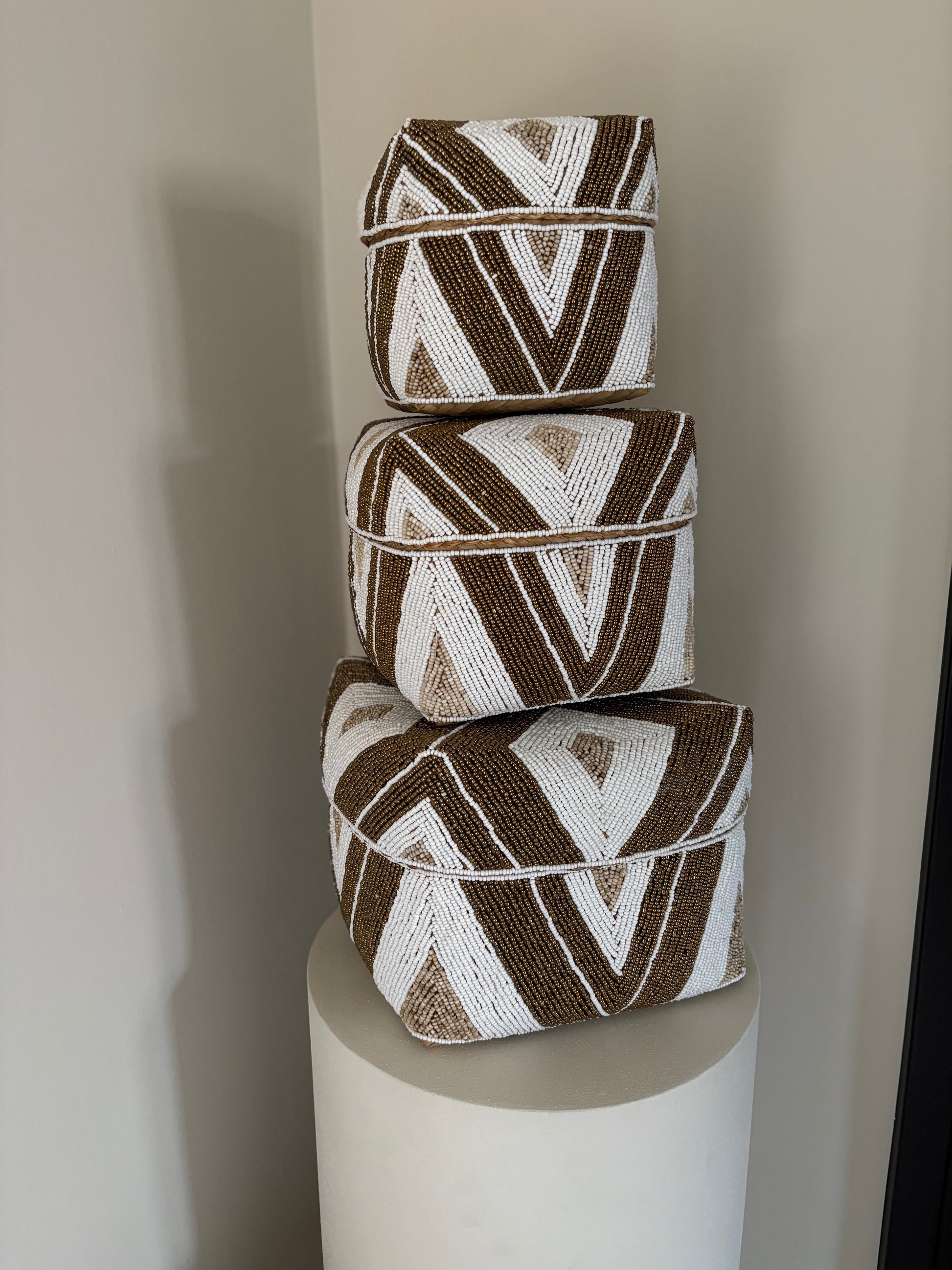 Een kralenmand of kralenmanden set voegt textuur en verfijning toe aan je interieur. De kralen zijn vaak met de hand bevestigd in patronen die symbool staan voor bescherming, geluk of harmonie – ideaal voor een serene sfeer in huis.
