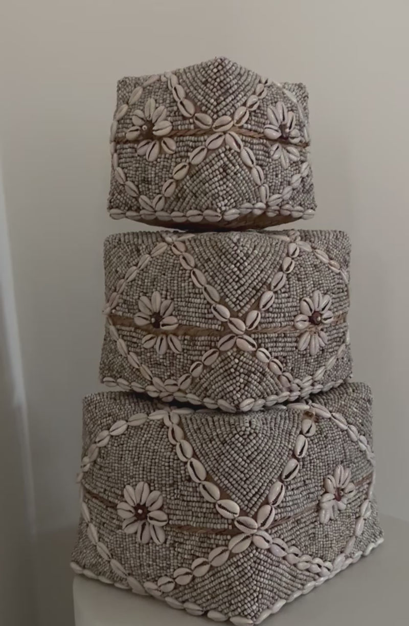Deze elegante opbergboxen zijn met de hand gevlochten van natuurlijke palmbladeren en volledig versierd met glaskralen. Deze prachtige offermanden zijn de eye catchers voor je interieur, gebruik ter decoratie voor in de vakkenkast, of op een dressoir. Daarnaast is het een stijlvolle manier om kleine items in op te bergen!