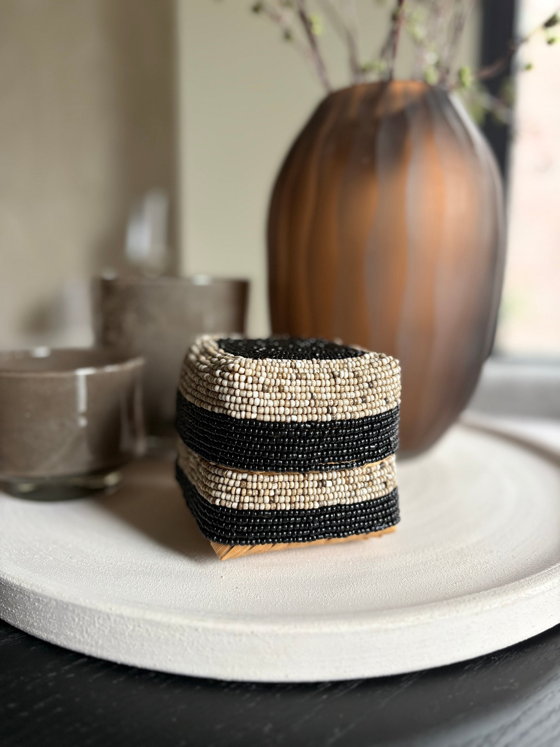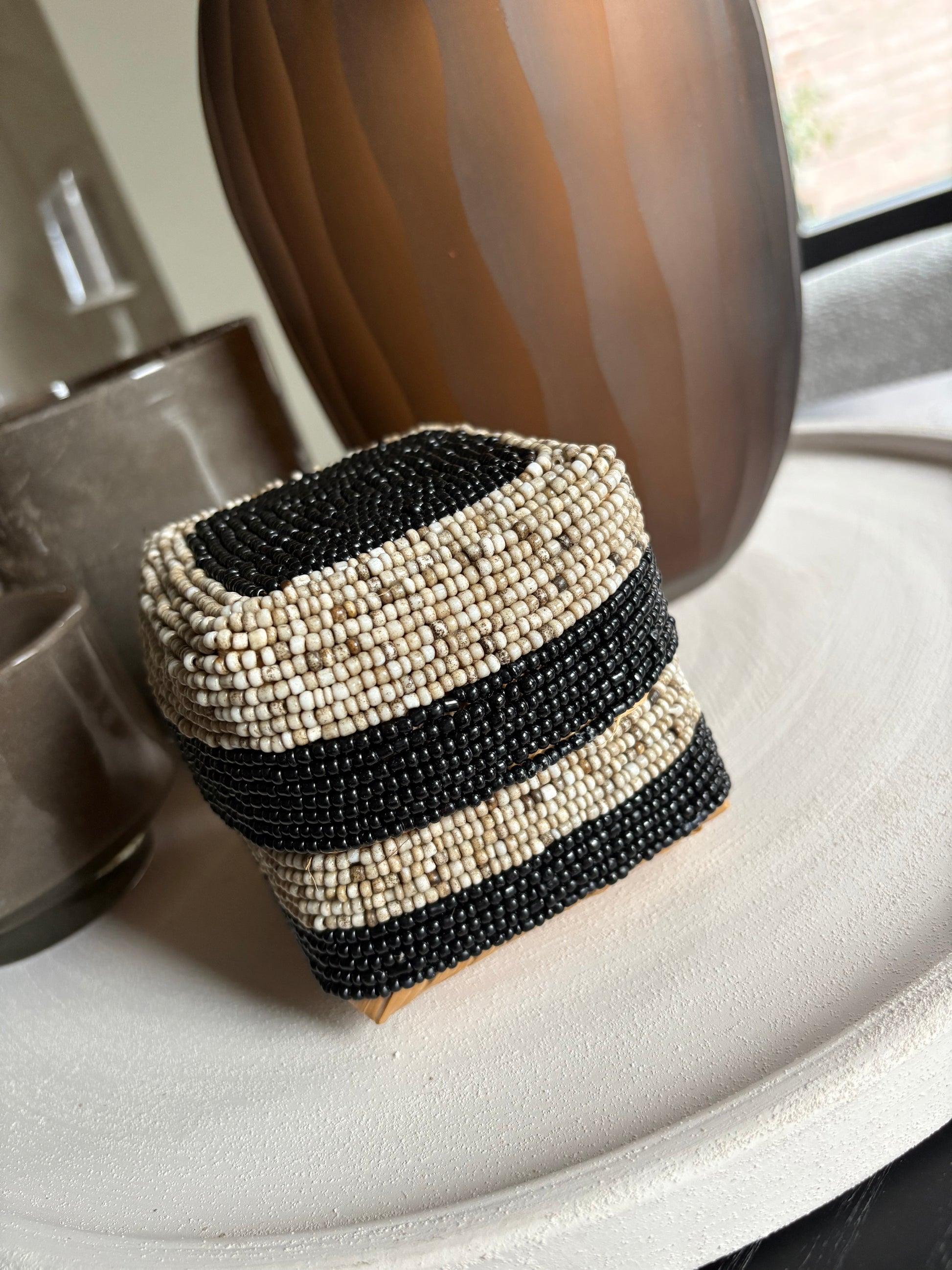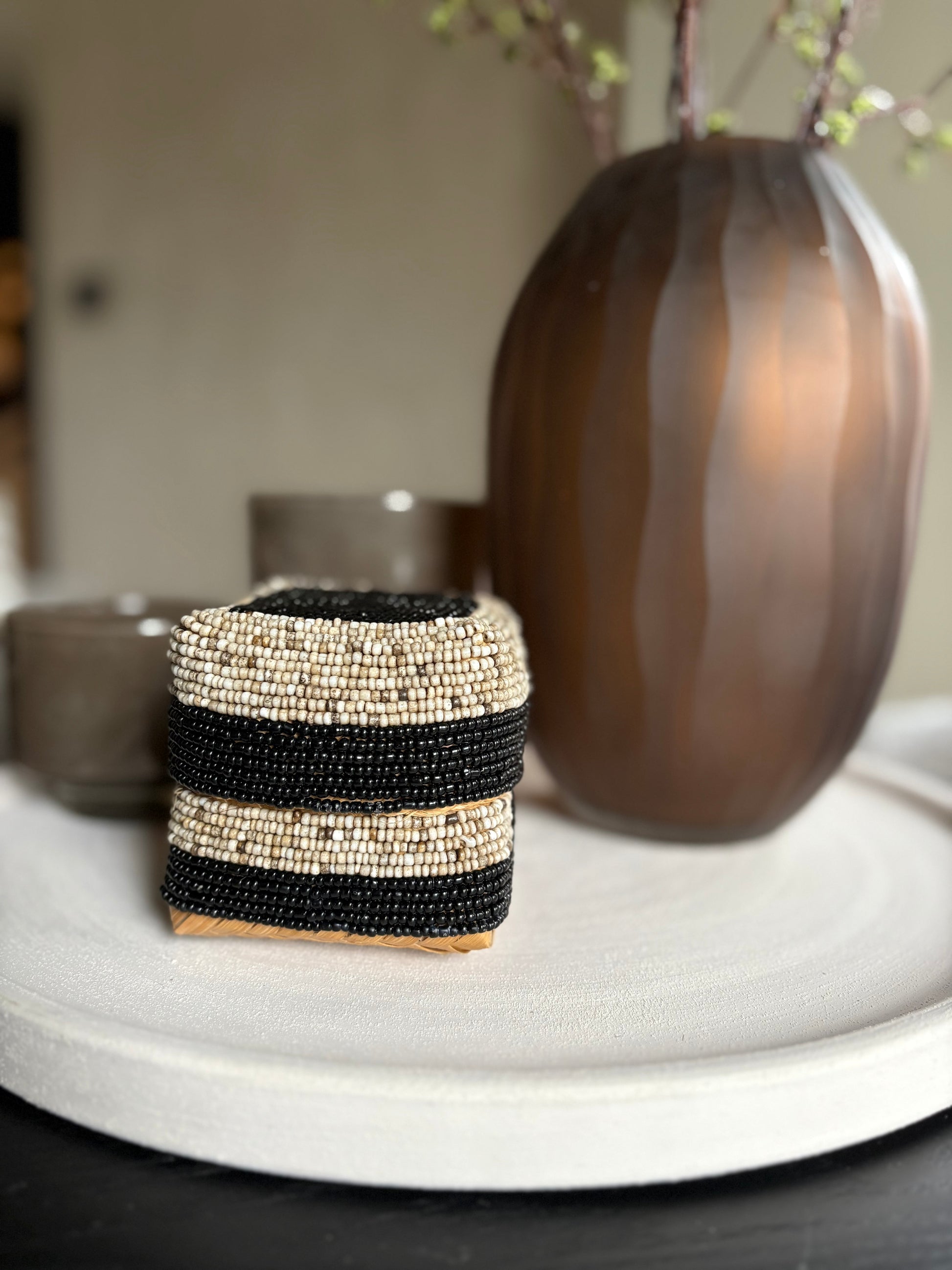 Deze elegante opbergboxen zijn met de hand gevlochten van natuurlijke palmbladeren en volledig versierd met glaskralen. Deze prachtige offermanden zijn de eye catchers voor je interieur, gebruik ter decoratie voor in de vakkenkast, of op een dressoir. Daarnaast is het een stijlvolle manier om kleine items in op te bergen!