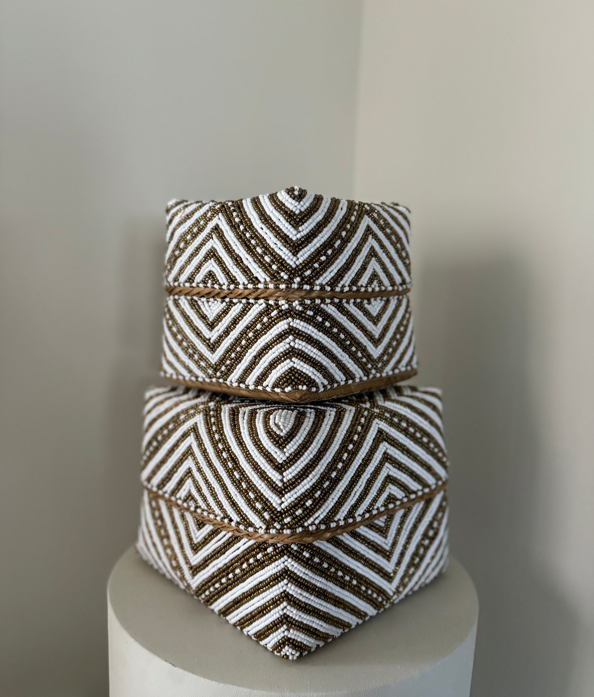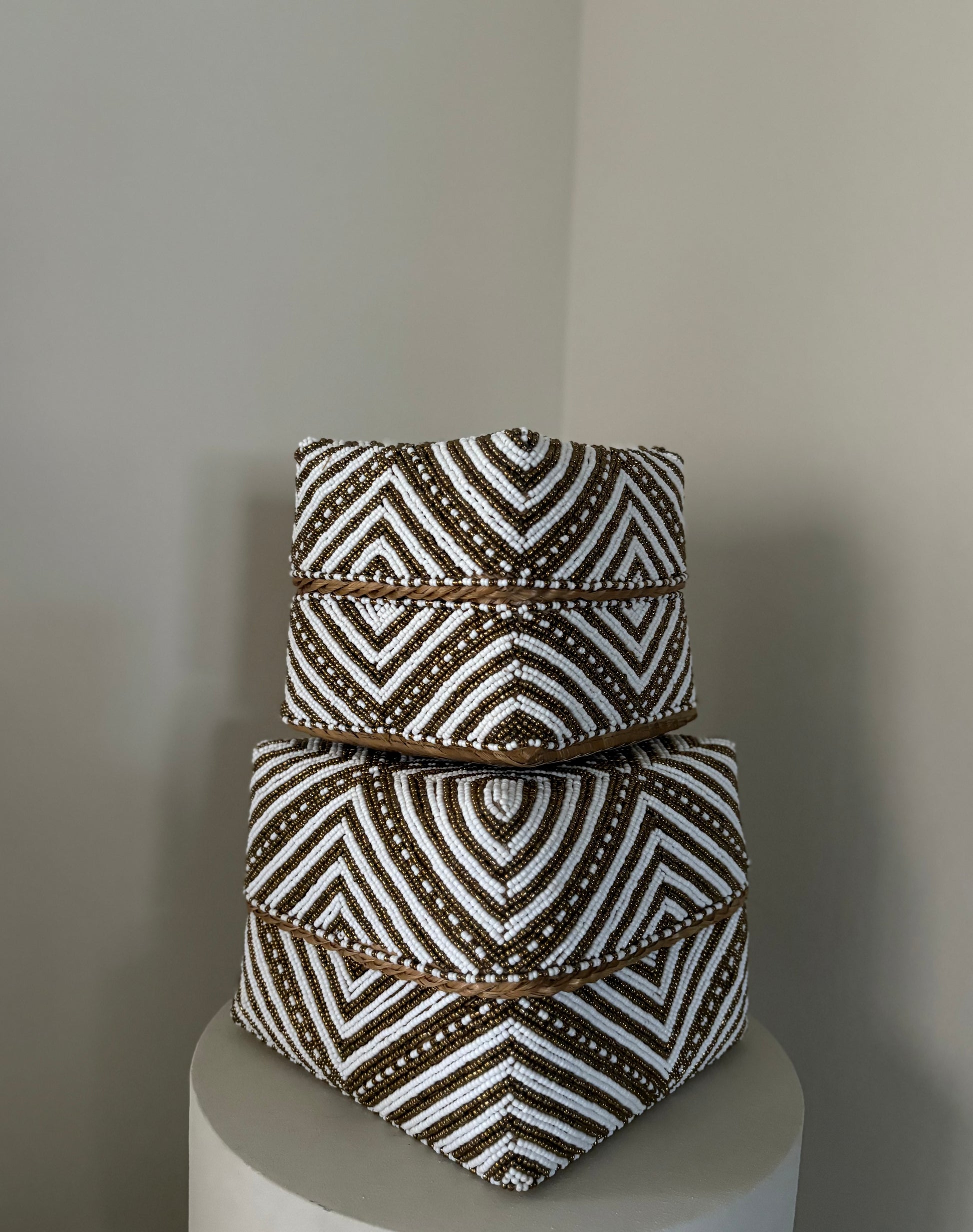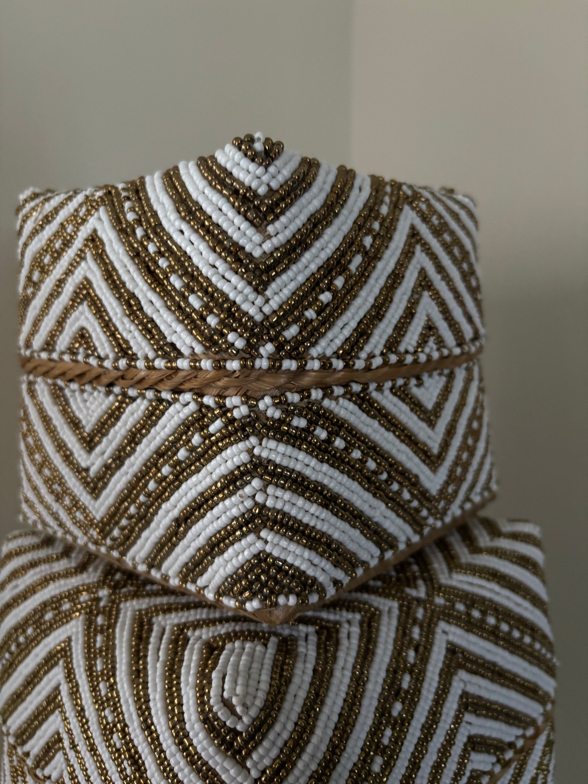 Deze elegante opbergboxen zijn met de hand gevlochten van natuurlijke palmbladeren en volledig versierd met glaskralen. Deze prachtige offermanden zijn de eye catchers voor je interieur, gebruik ter decoratie voor in de vakkenkast, of op een dressoir. Daarnaast is het een stijlvolle manier om kleine items in op te bergen!