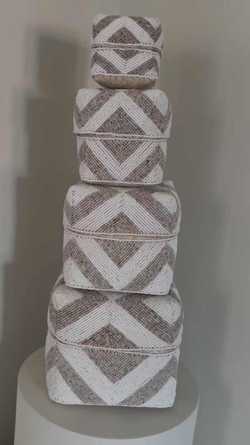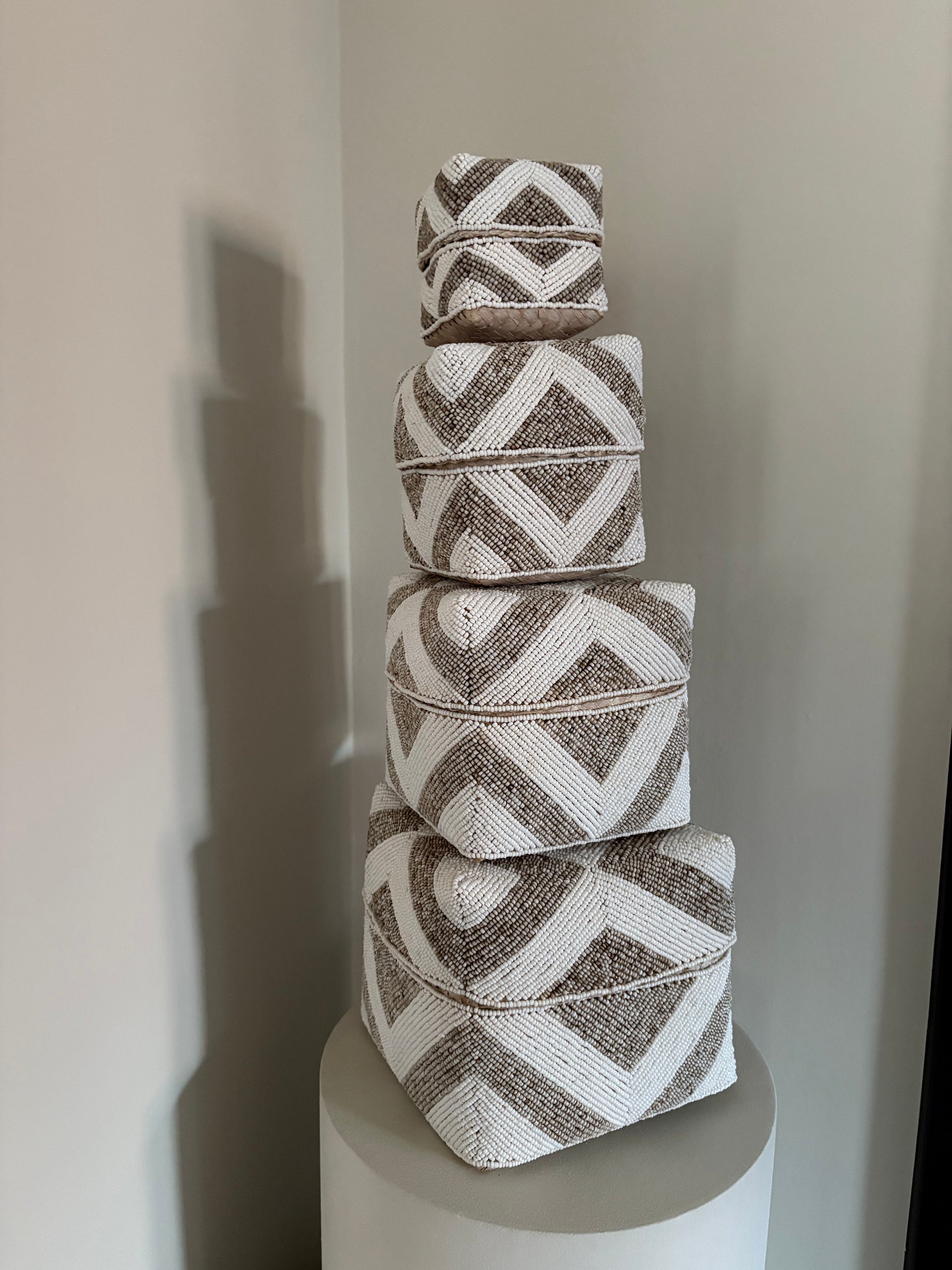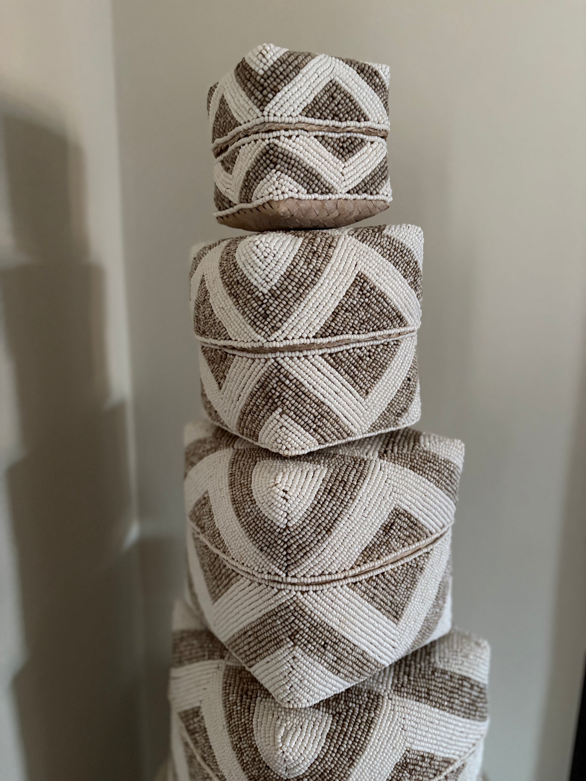 Deze elegante opbergboxen zijn met de hand gevlochten van natuurlijke palmbladeren en volledig versierd met glaskralen. Deze prachtige offermanden zijn de eye catchers voor je interieur, gebruik ter decoratie voor in de vakkenkast, of op een dressoir. Daarnaast is het een stijlvolle manier om kleine items in op te bergen!