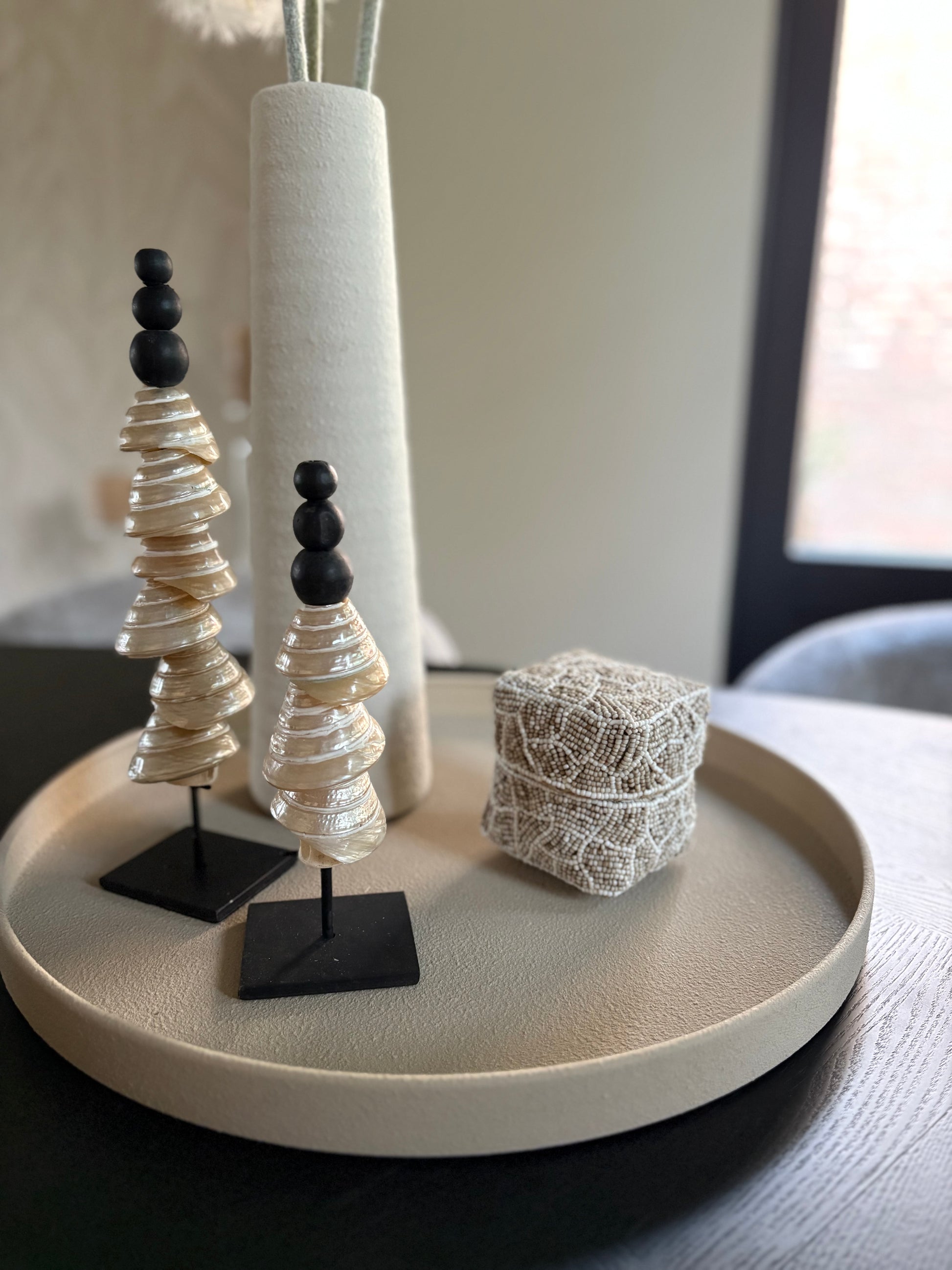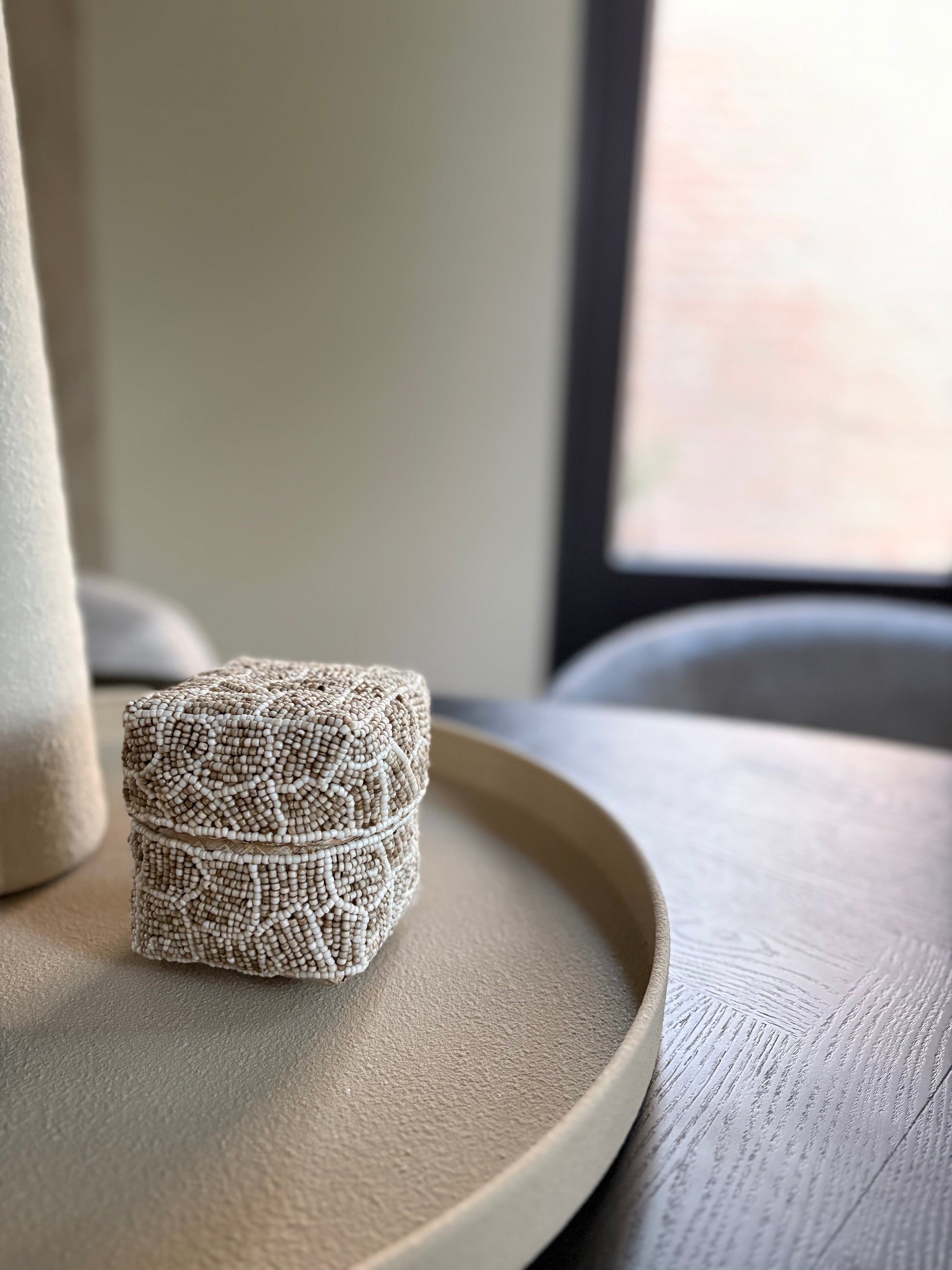 Een kralenmand of kralenmanden set voegt textuur en verfijning toe aan je interieur. De kralen zijn vaak met de hand bevestigd in patronen die symbool staan voor bescherming, geluk of harmonie – ideaal voor een serene sfeer in huis.