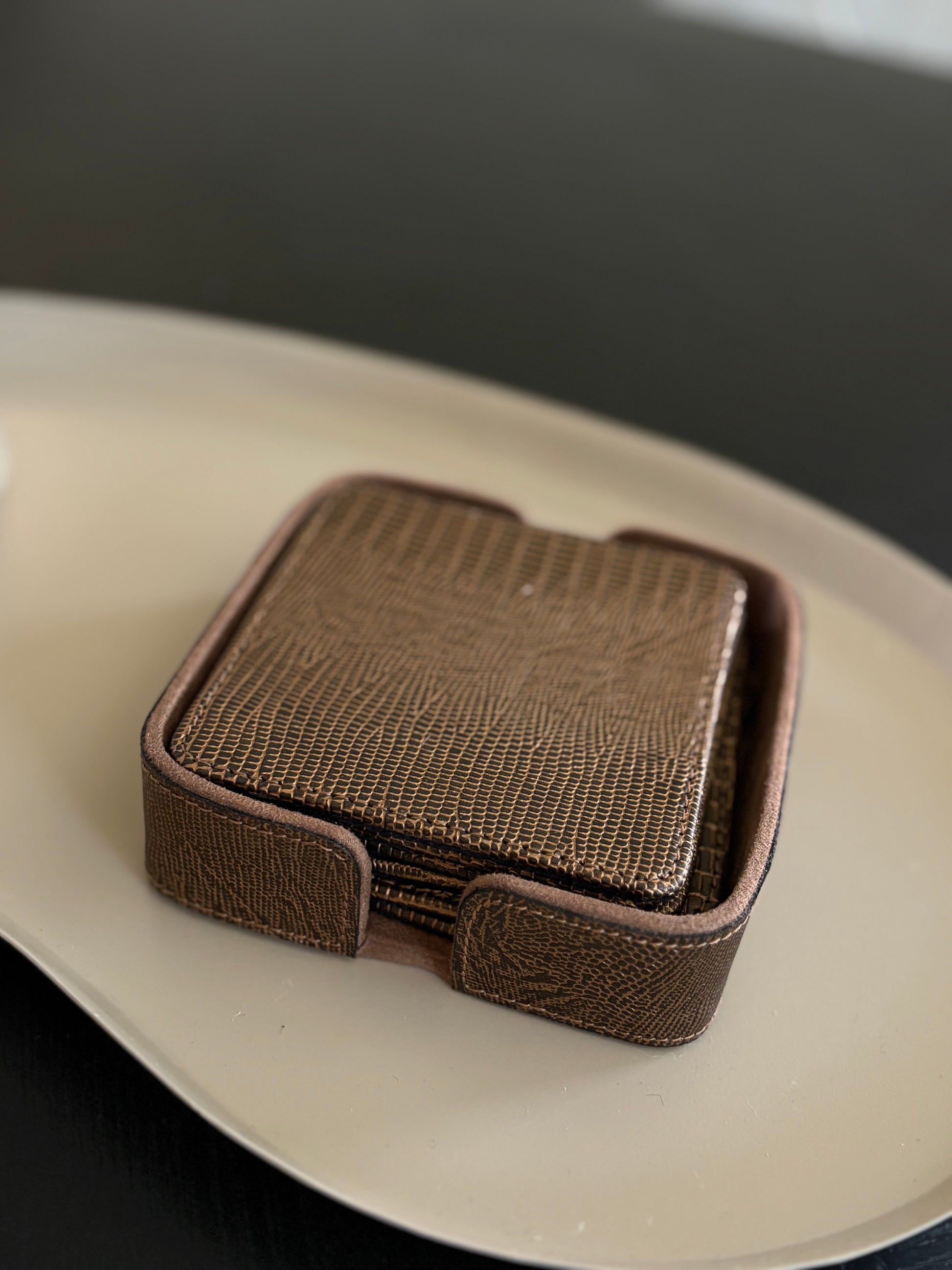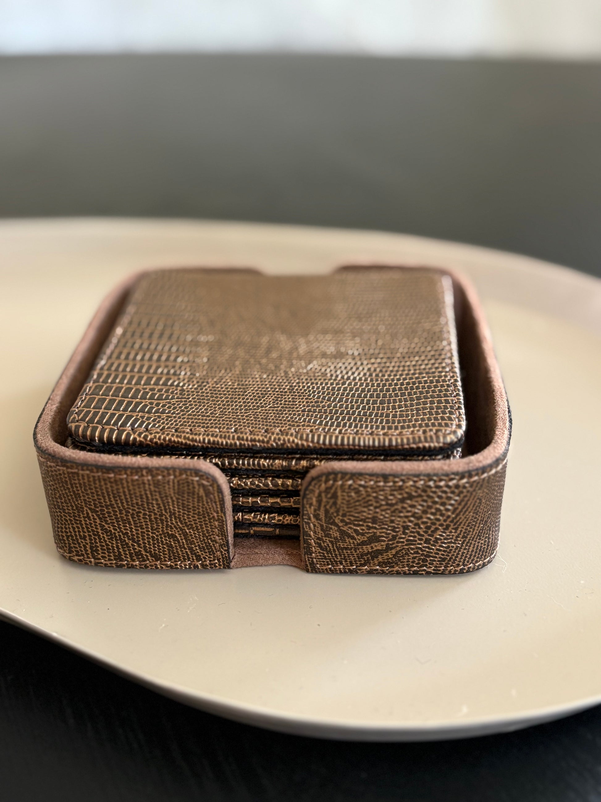 Mooie onderzetters van nep leer. De onderzetters hebben een vilten onderkant en een slangen patroon. Ook zitten de onderzetters in een bijpassende houder. De set bestaat uit zes onderzetters.