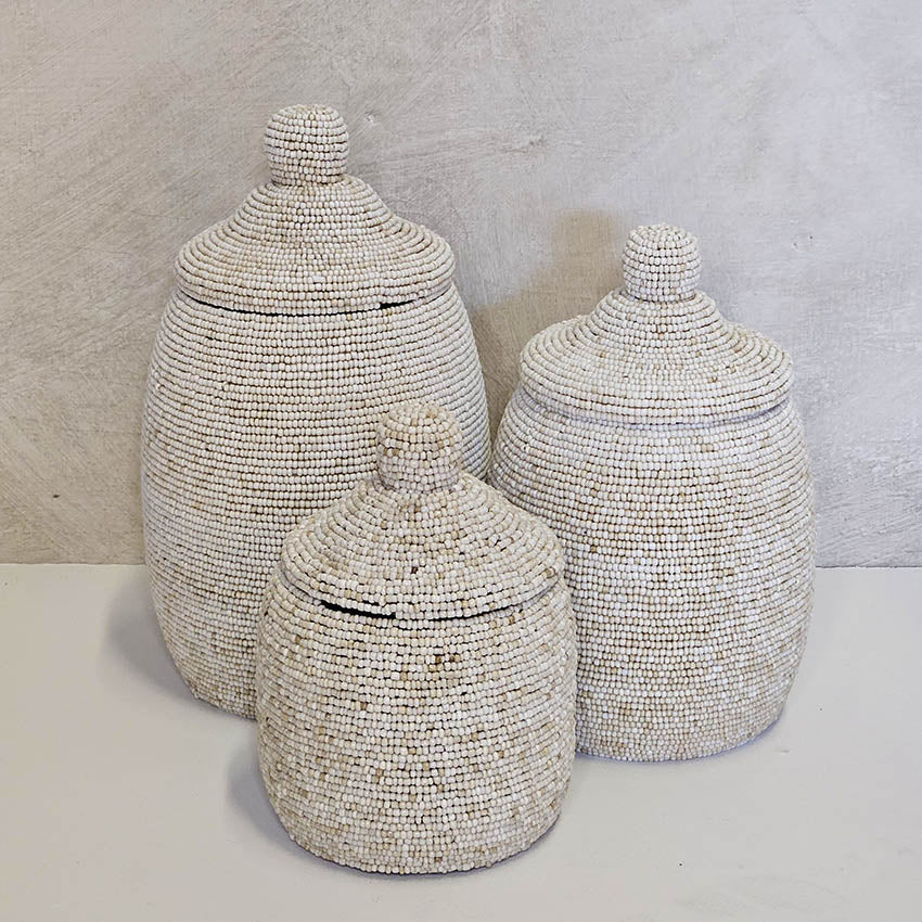 Een kralenmand of kralenmanden set voegt textuur en verfijning toe aan je interieur. De kralen zijn vaak met de hand bevestigd in patronen die symbool staan voor bescherming, geluk of harmonie – ideaal voor een serene sfeer in huis.