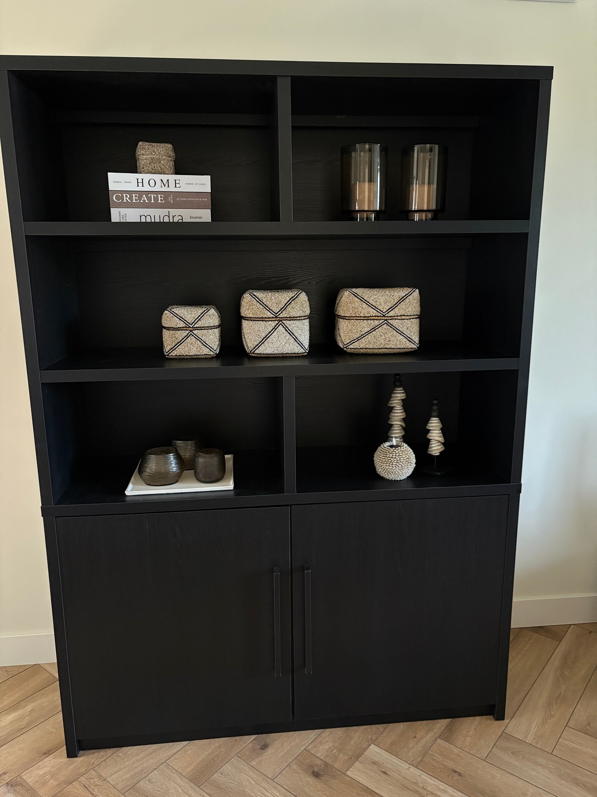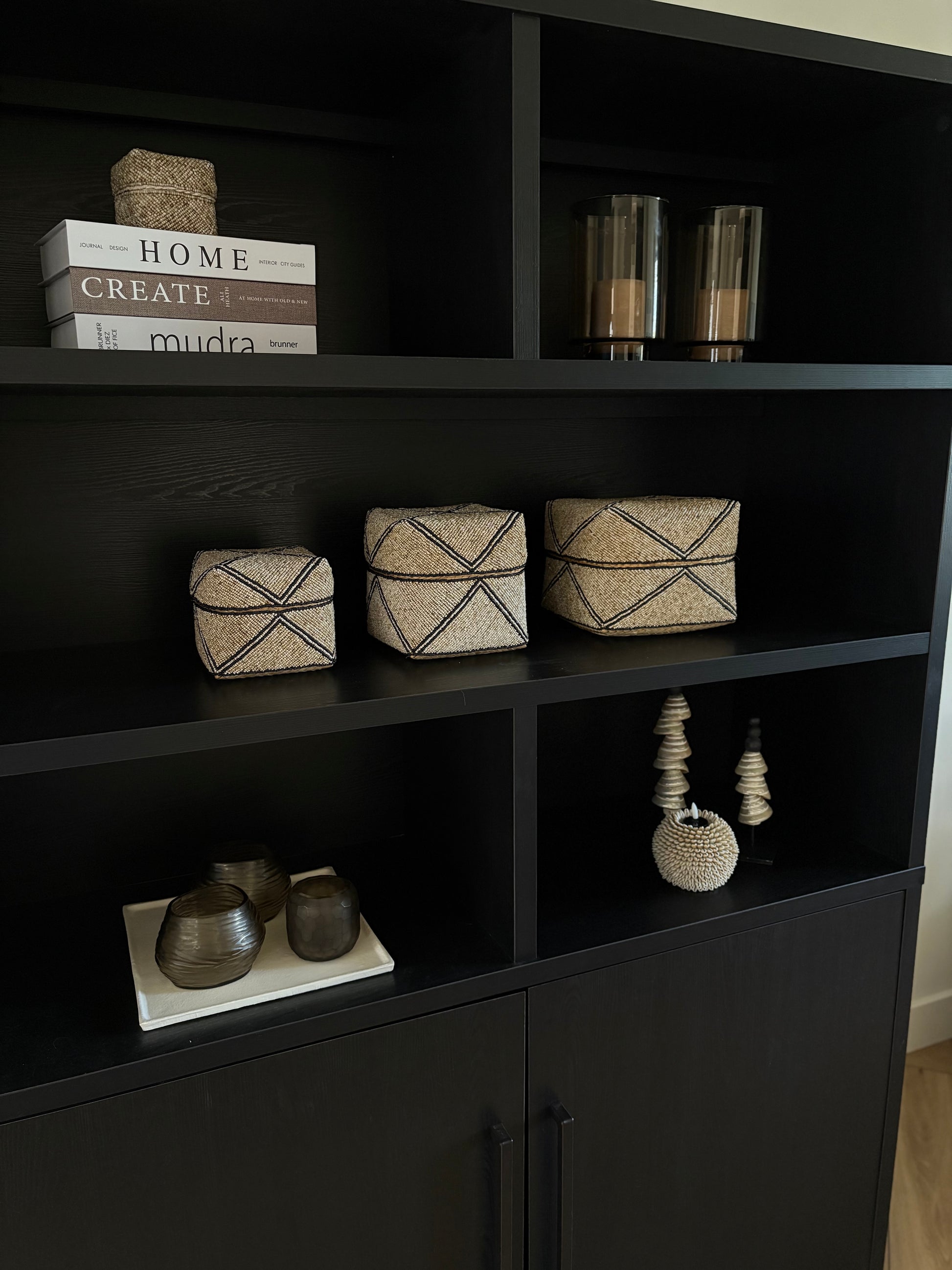 Een populaire manier om offermanden te gebruiken in huis is door ze te stylen in een vakkenkast. De symmetrie van de kast en de ronde vormen van de manden zorgen voor een spannend contrast. Kies bijvoorbeeld voor een set offermanden in verschillende groottes en kleuren – denk aan beige, crème en goud – en creëer een stijlvol statement in je woonkamer, hal of slaapkamer.