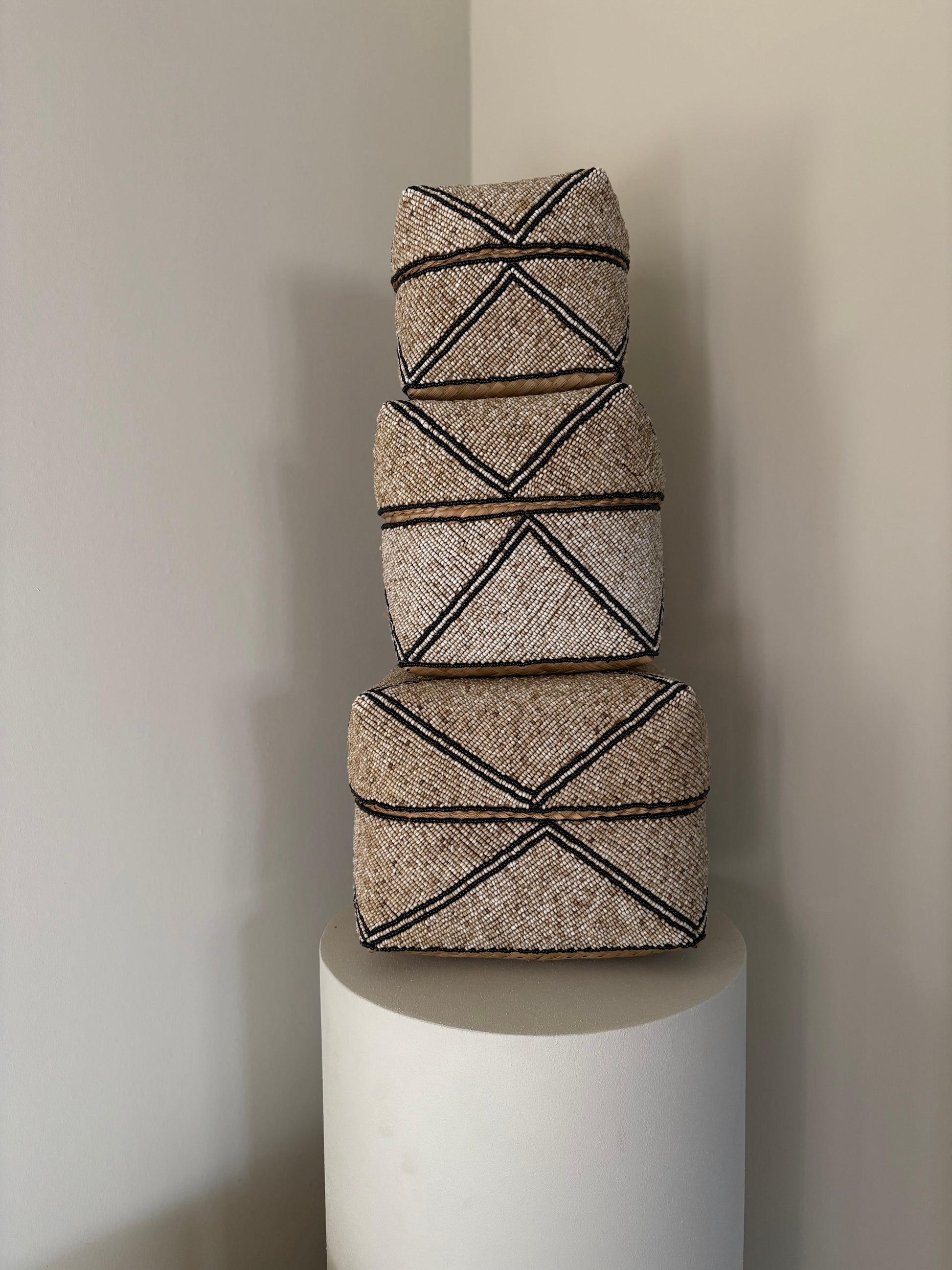 Een kralenmand of kralenmanden set voegt textuur en verfijning toe aan je interieur. De kralen zijn vaak met de hand bevestigd in patronen die symbool staan voor bescherming, geluk of harmonie – ideaal voor een serene sfeer in huis.