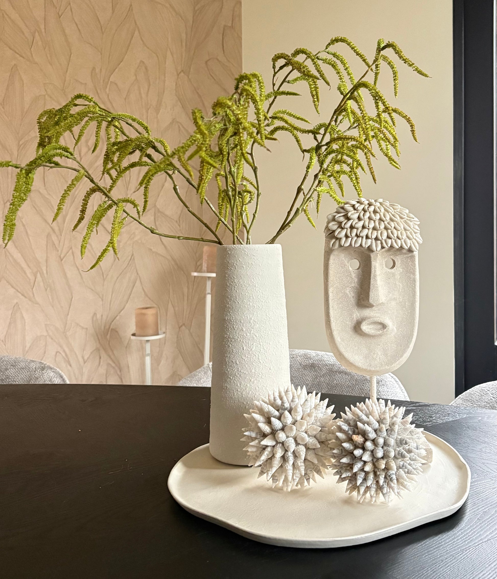 Dit is een prachtige ornament voor je interieur, dit leuke ornament is in de vorm van een gezicht gemaakt met daarop echte kauri schelpen. Het ornament is gemaakt van steen en hars. Het heeft een unieke, gestructureerde textuur. De beige kleur geeft het een natuurlijke, warme uitstraling die goed past in verschillende interieurstijlen. Deze staander is een mooi accent voor op een wandplank of in de vakkenkast.