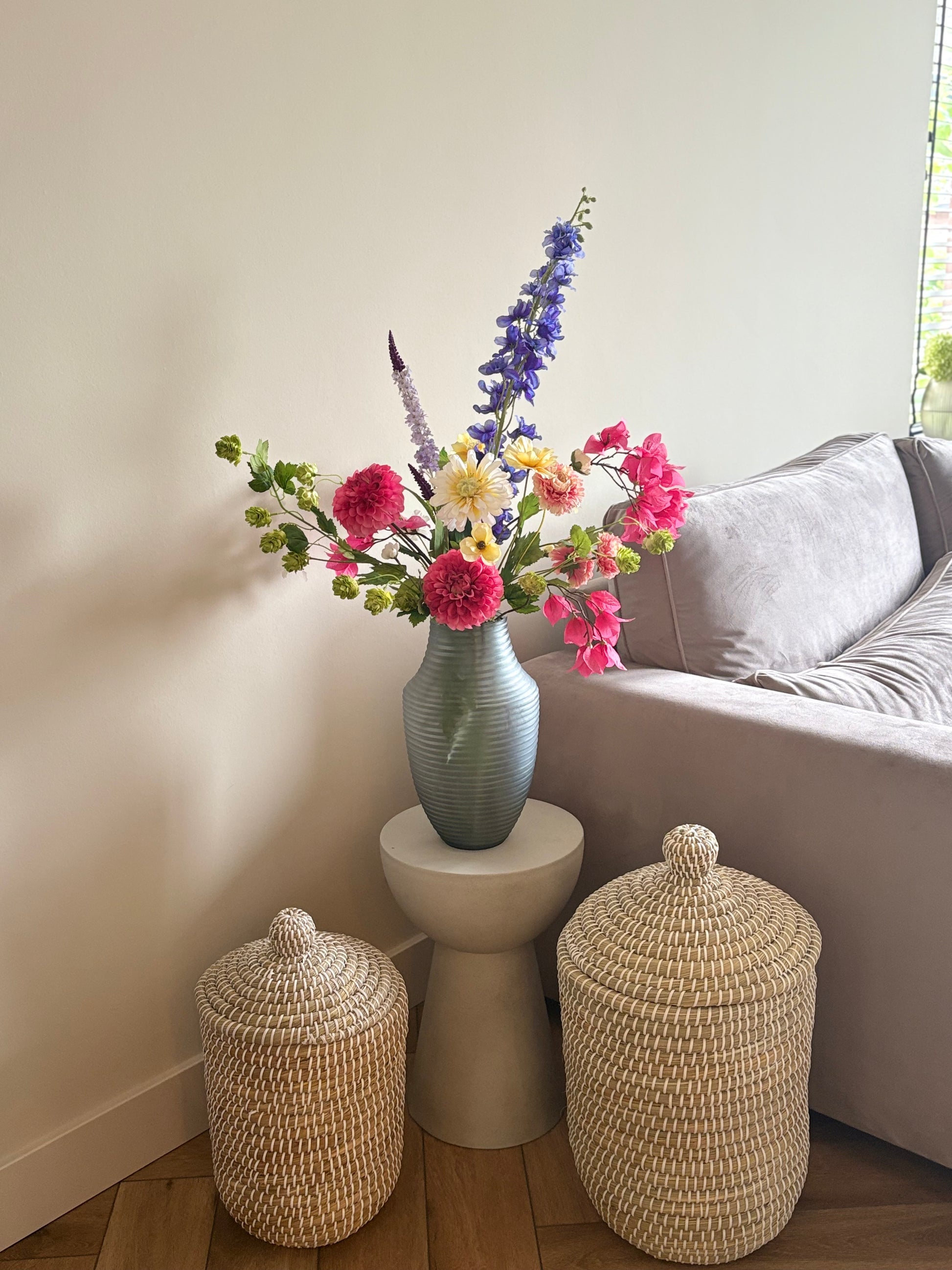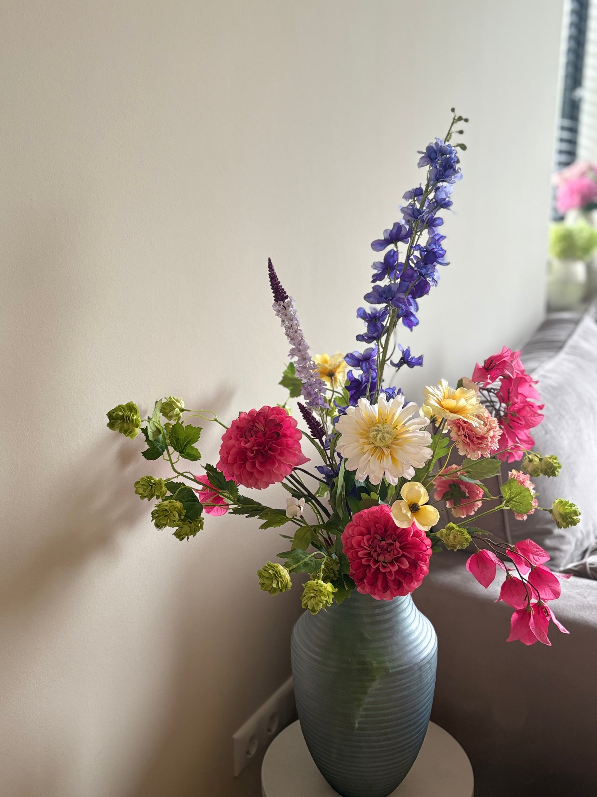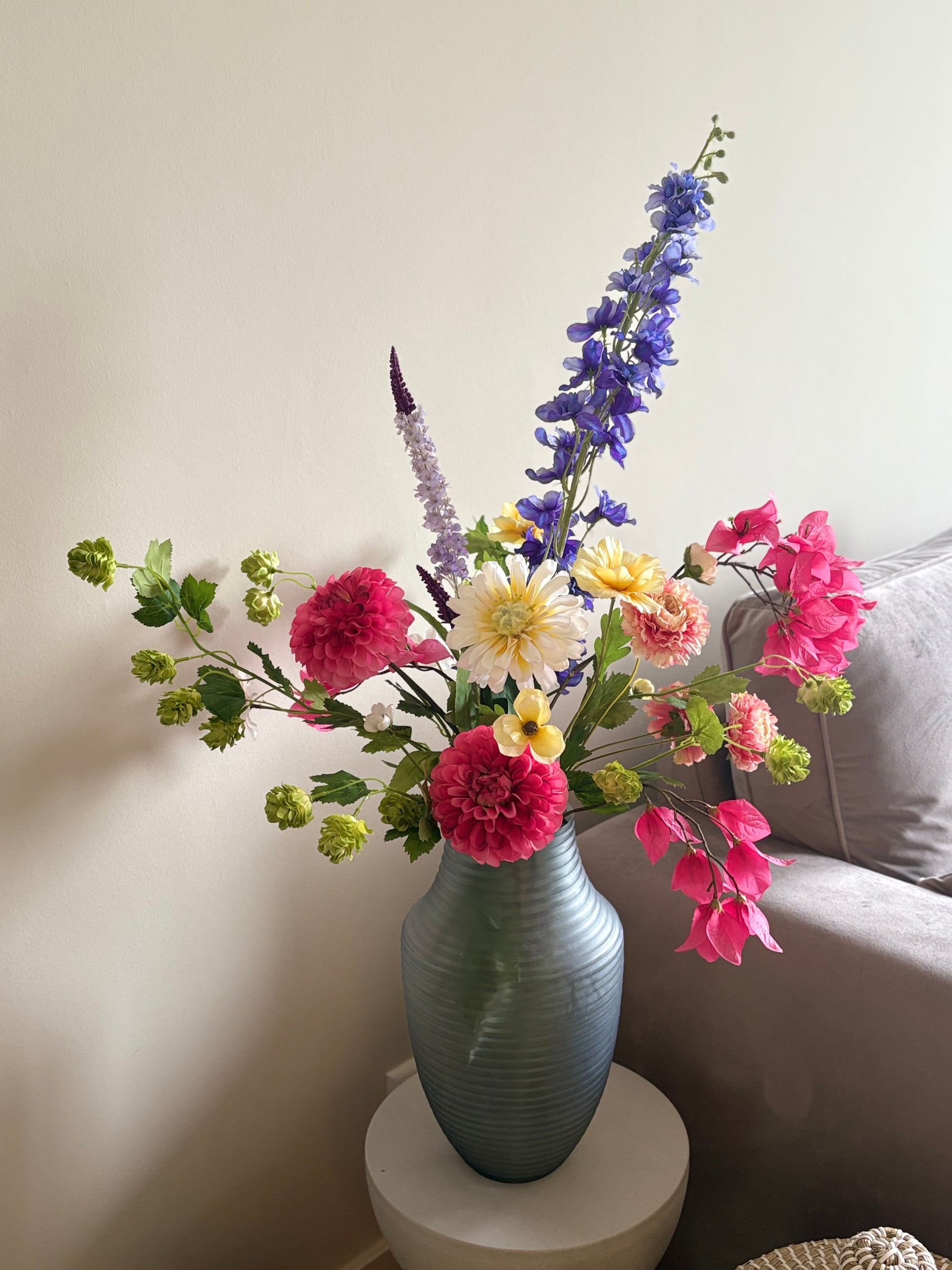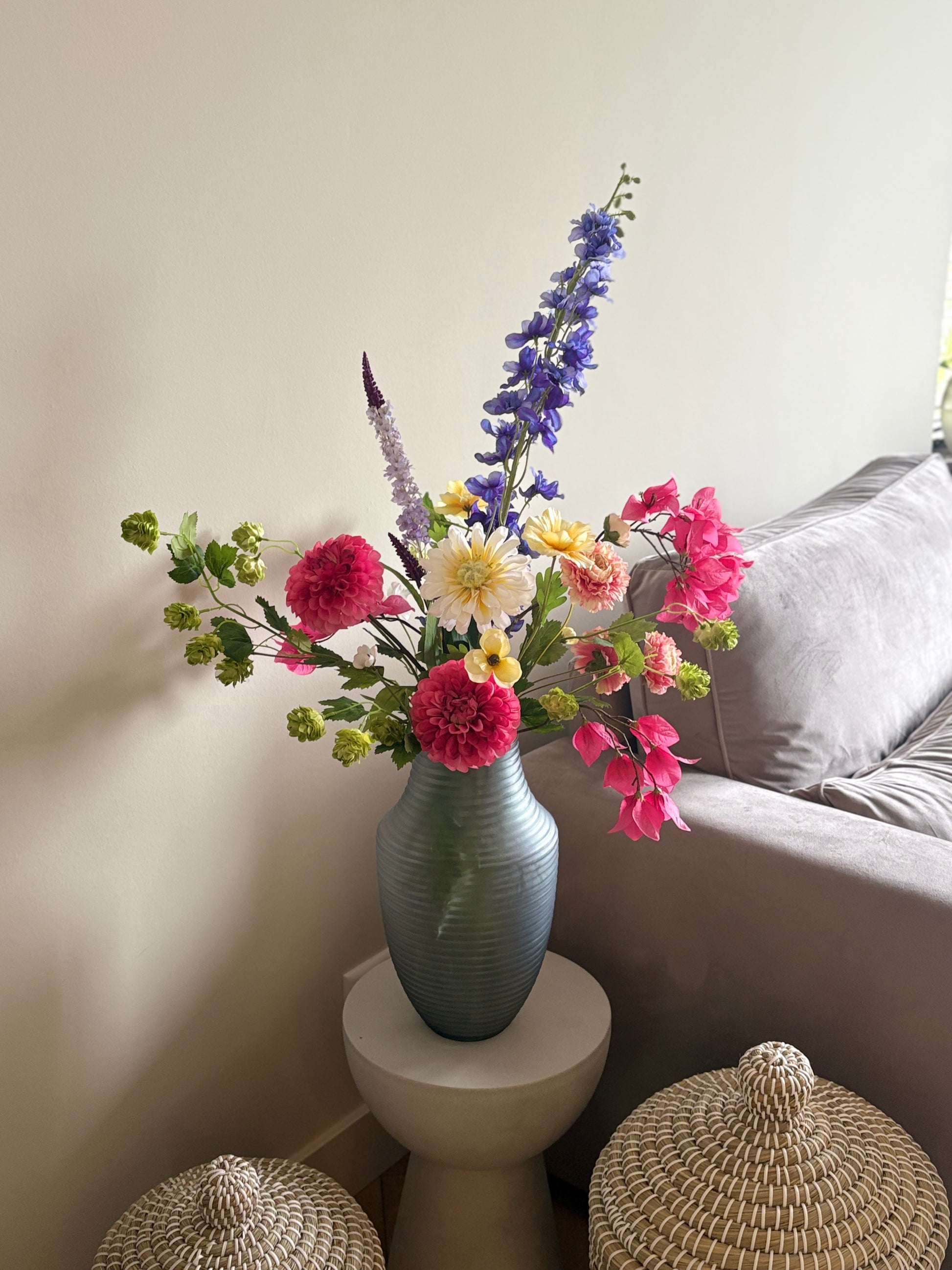 Het zijdenboeket BO is perfect voor verschillende plekken in huis. Zet het bijvoorbeeld op de eettafel als kleurrijke eyecatcher tijdens ontbijt of diner, op de salontafel voor een vrolijke sfeer in de woonkamer, of op een bijzettafel om een saaie hoek direct nieuw leven in te blazen. Dankzij het kleurrijke, speelse en veldboeket-achtige karakter past dit boeket prachtig in een modern, bohemian, kleurrijk of eclectisch interieur.