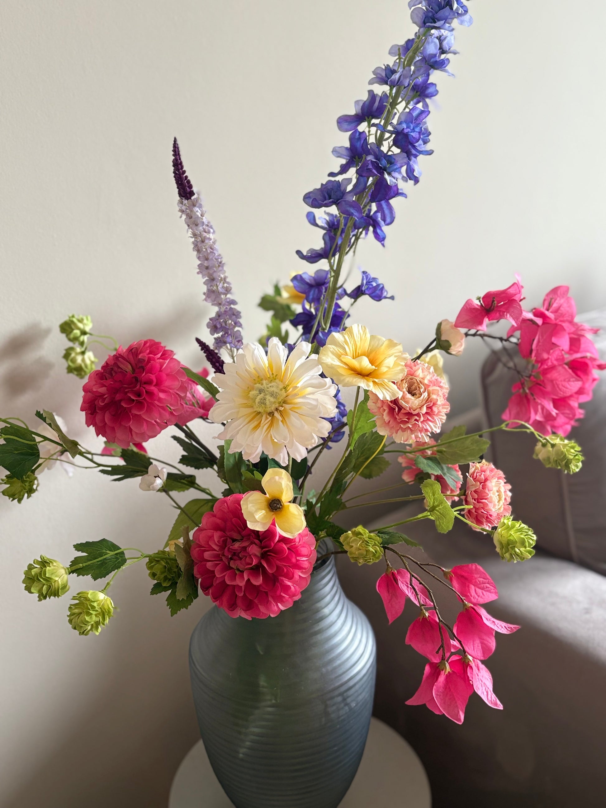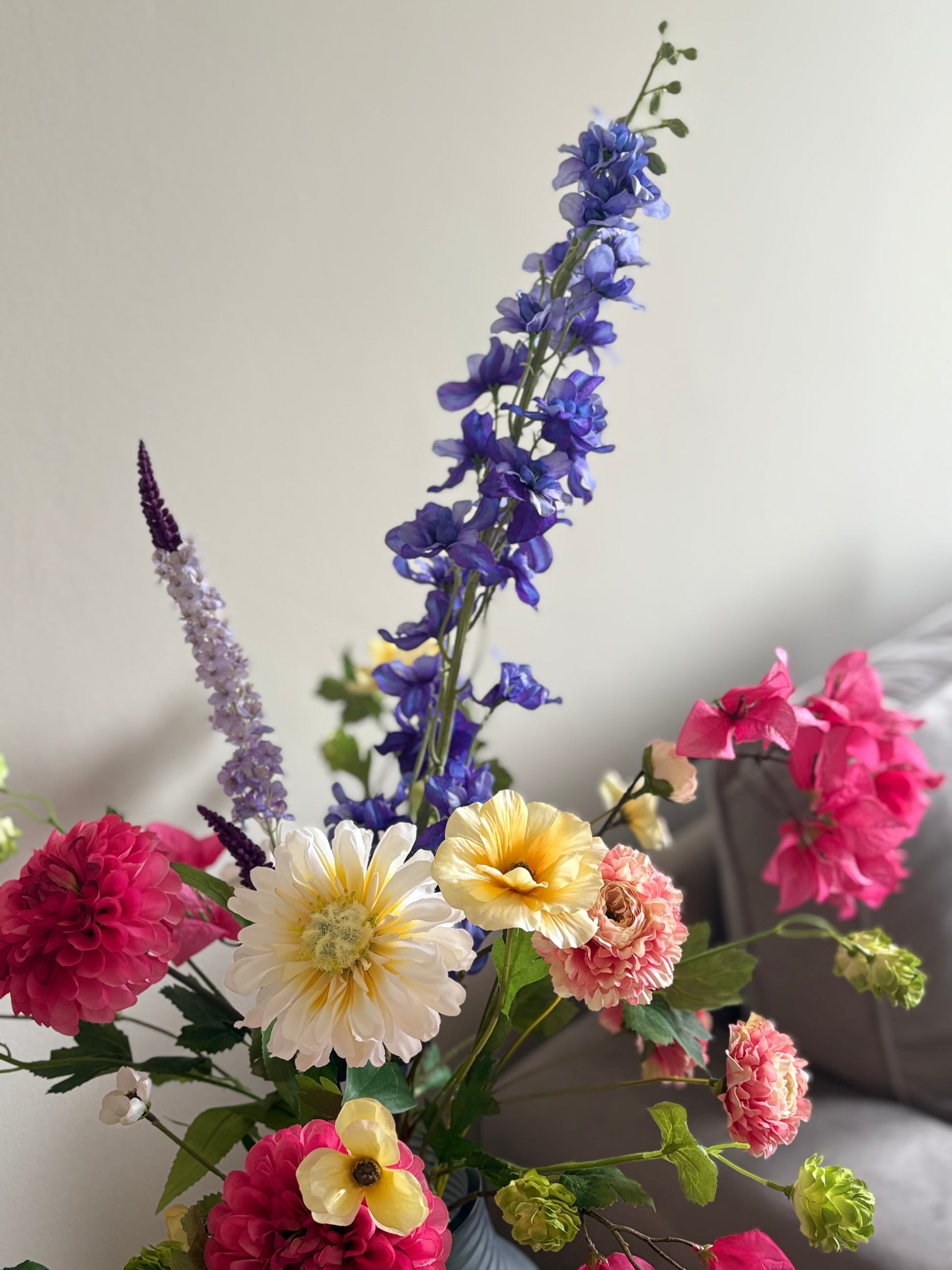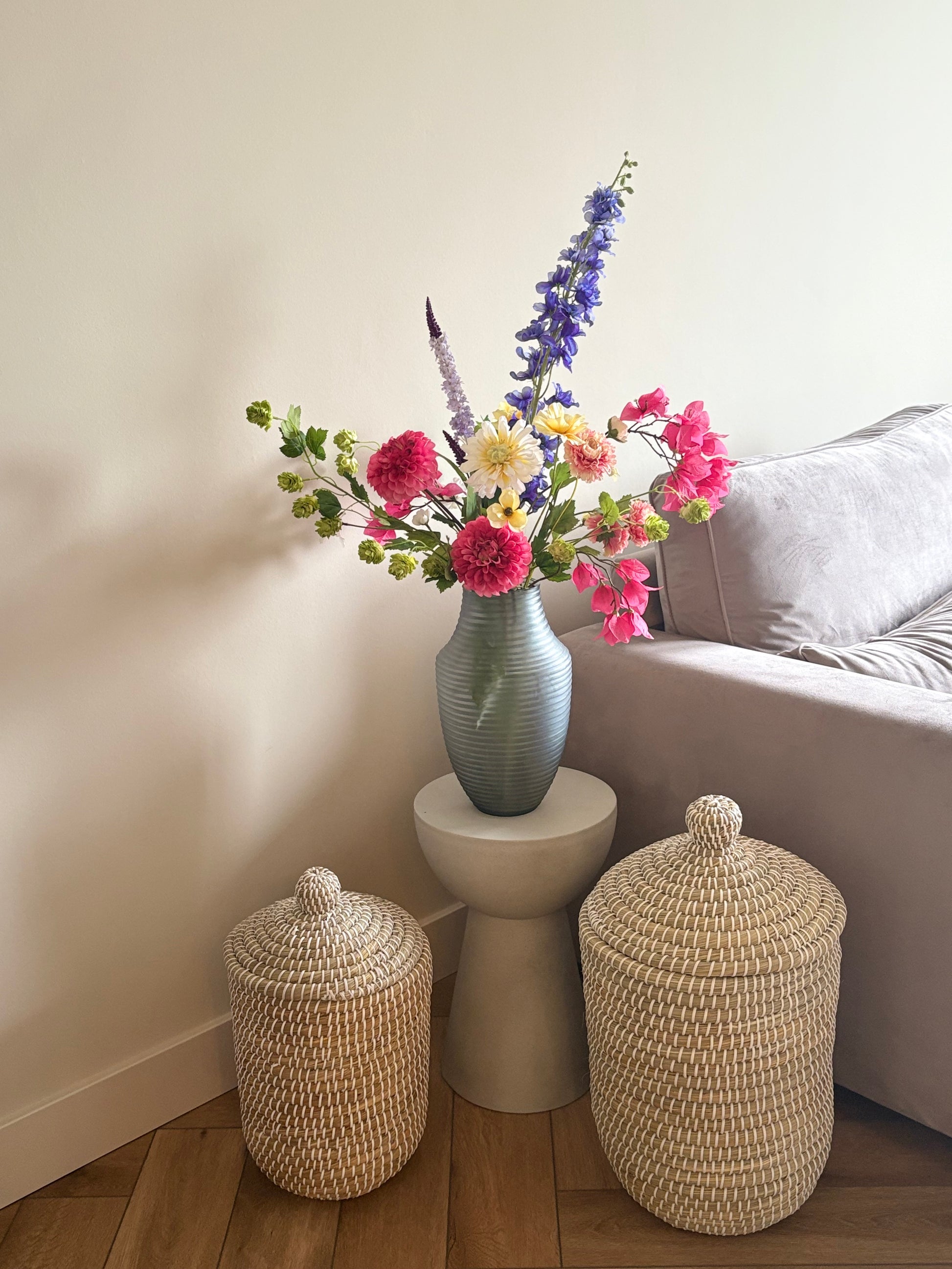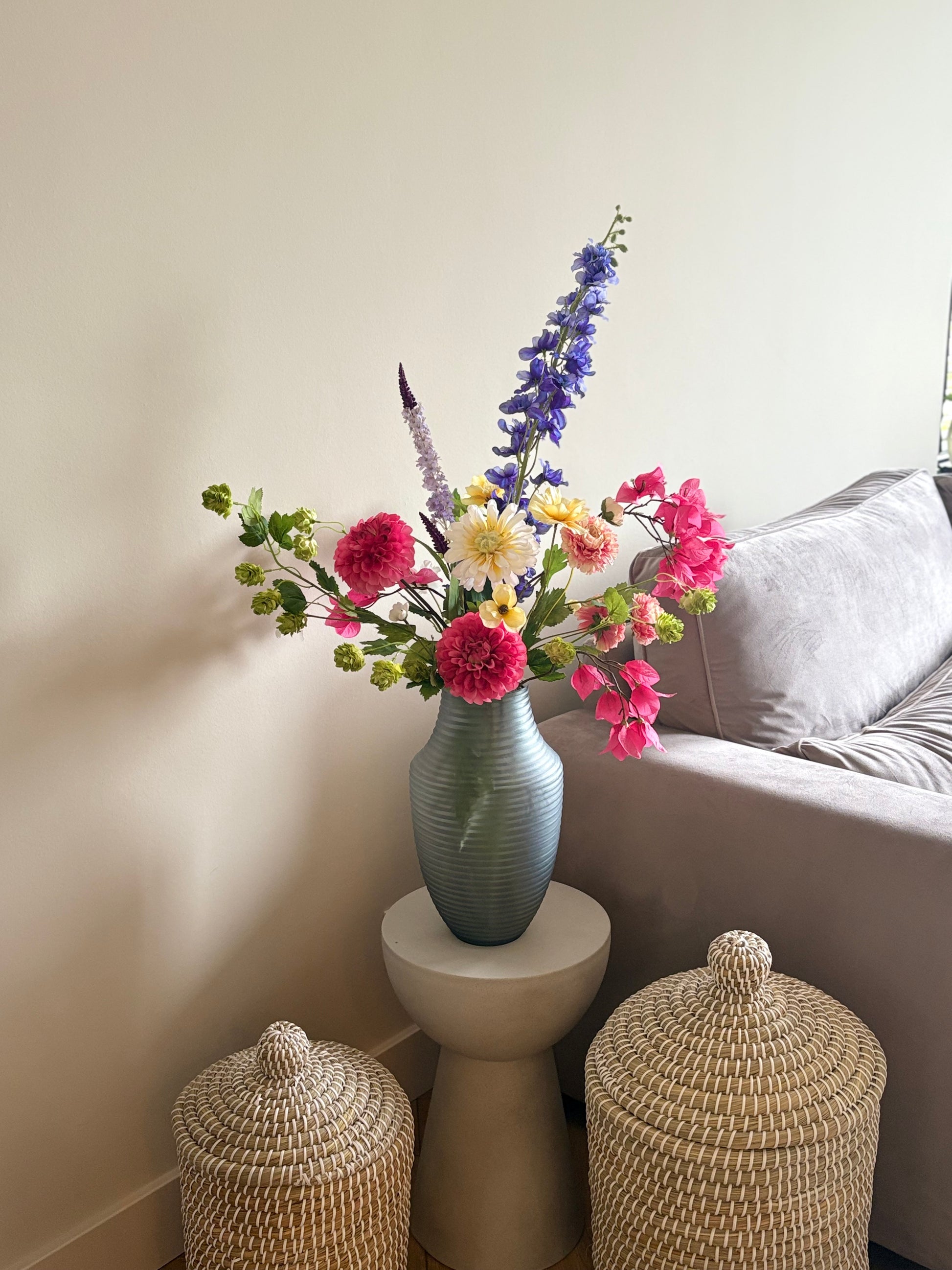 Het zijdenboeket BO is perfect voor verschillende plekken in huis. Zet het bijvoorbeeld op de eettafel als kleurrijke eyecatcher tijdens ontbijt of diner, op de salontafel voor een vrolijke sfeer in de woonkamer, of op een bijzettafel om een saaie hoek direct nieuw leven in te blazen. Dankzij het kleurrijke, speelse en veldboeket-achtige karakter past dit boeket prachtig in een modern, bohemian, kleurrijk of eclectisch interieur.